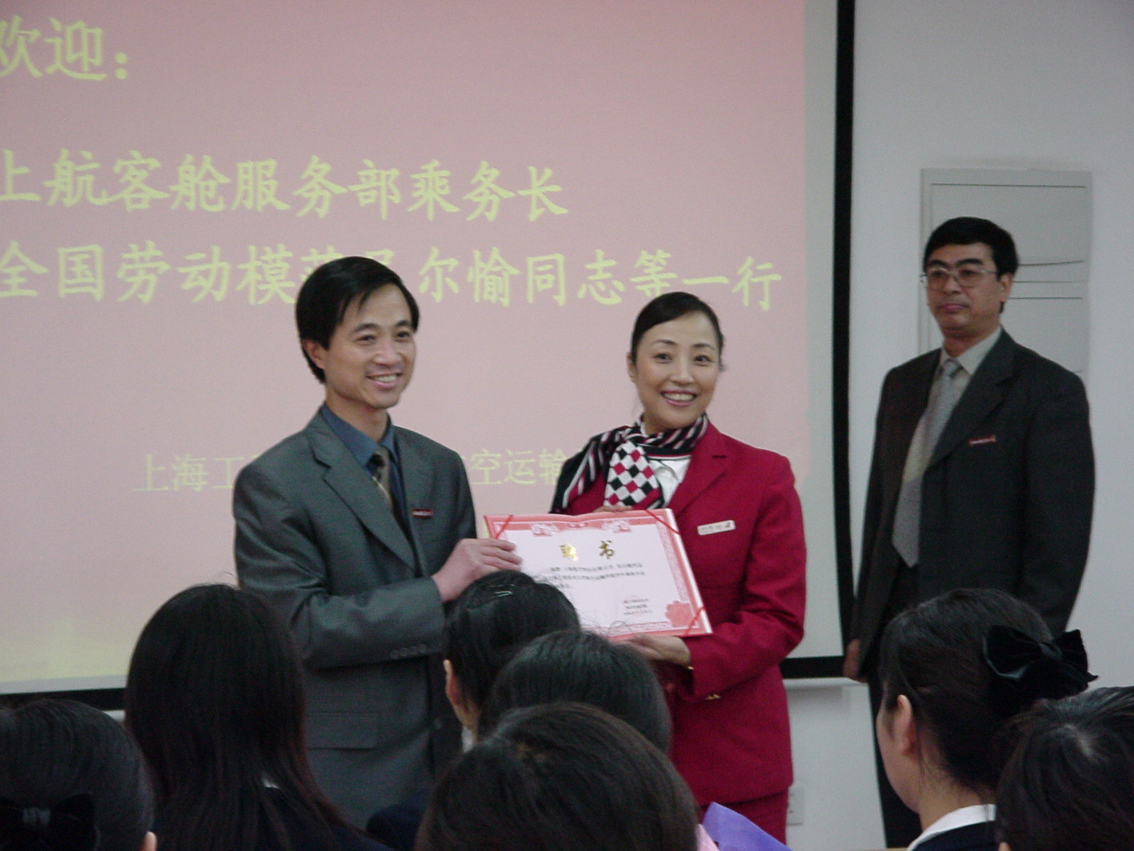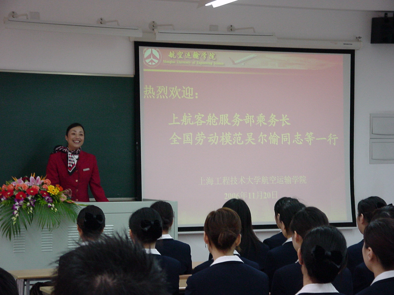 2006年11月20日下午15:00,全国劳模、五一奖章获得者、上航客舱服务部乘务长吴尔愉同志,上航客舱服务部主任乘务长薛萍,上航客舱服务部谭何易,我院首届乘务班毕业生、客舱服务部舱位长邱玥,上航培训中心刘岩等一行五人,应邀来我校与航空运输学院2004级乘务专业全体学生亲切交流。此次活动由航院总支书记卫国林主持,魏建院长首先向吴尔愉同志颁发航空学院空中乘务专业校外辅导员的聘书。随后,吴尔愉同志就空乘职业生涯的感悟与同学们进行了交流。吴尔愉同志柔声细语地将自己的亲身体会娓娓道来,象一缕清泉给同学们带来一份清新。接着,乘务班的同学与来宾们进行互动,客舱服务部的几位空姐以及学姐邱玥热情亲切地回答了同学们所关心的问题,同时还希望她们要学会自我管理,关心社会,关心时事,珍惜青春以及宝贵的大学时光,很好地规划自己的人生,提高综合素养,使自己能够成为上航所需要的未来乘务员。她们还告诉同学们上航未来几年内发展迅猛,需要大量优秀的乘务长,“需要学习的太多只是时间不够”,“不要先求回报,功利心太重”等等。她们的谆谆教诲和优雅的风度赢得了同学们的心,大家以热烈的掌声表达了对吴尔愉等优秀乘务员的尊敬与喜爱。最后,航院向吴尔愉等一行赠送了景泰蓝校徽。