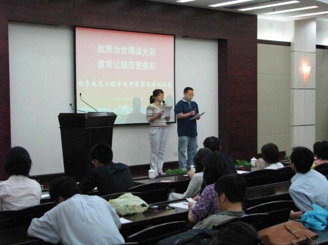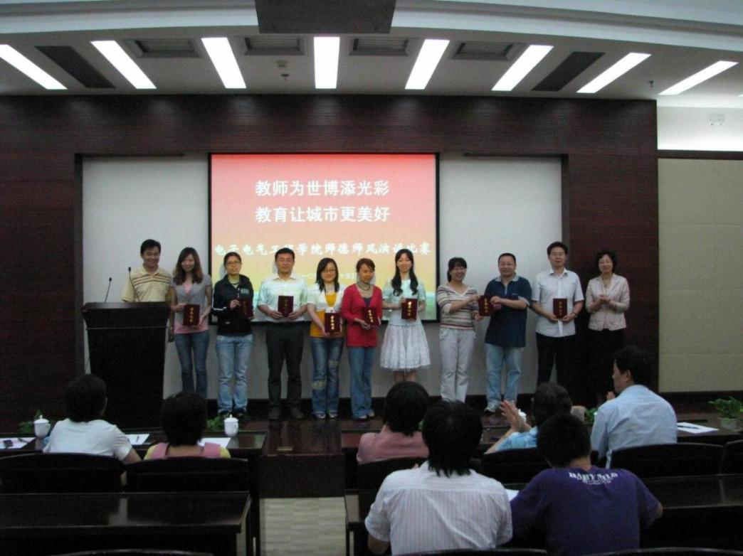 |  为谱写世博华美的乐章,迎接中国共产党89岁的生日,6月25日下午在图文信息中心第三报告厅,电子电气工程学院隆重举行师德师风演讲比赛。校工会韩玉德老师参加了此次活动,学院院长刘启中、党总支书记茅蕾、副院长张丽萍、党总支副书记王东阳以及全体教师出席了演讲比赛,各系室支部书记担任此次比赛的评委,各系室教师代表参赛。 比赛中,教师代表们运用各种演讲技巧,或抑扬顿挫,或慷慨激昂,自然的真情流露感染了在场的师生,他们的演讲勾画了教师们忙碌的身影,凸显了教师在世博舞台上的突出成绩,体现了教师身上肩负着教育使命的重任,以及为学生营造良好的学习环境、培养创新型技术类人才、激发学生的创造力所作出的努力。 经过评委们的认真打分,本次师德演讲比赛中学院学生工作办公室梅元媛获得一等奖;自动化系王宇嘉、陈小龙、计算机中心张晓梅、计算机系黄润才获得二等奖;中心实验室朱文立、电气工程及其自动化张菁、电子信息工程系王永琦以及代表电子基础教研室的陈万辉获得三等奖。 最后,学院党总支书记茅蕾讲话,她希望教师们对自己的岗位继续保持高度的责任意识,牢记“教育为本,以德为先”,弘扬优秀教师的先进事迹,全面推进师德师风建设,做到爱岗敬业,为人师表,做教书育人的楷模;锐意进取,追求卓越,作自主创新的先锋;求真务实,严谨治学,做高尚学术道德的榜样;希望大家发扬团队精神,为学院内涵建设和科学发展贡献自己的力量,为学院的教育事业再建新功。 | | | 稿件作者:陆锦帅 责任编辑:陈文琼