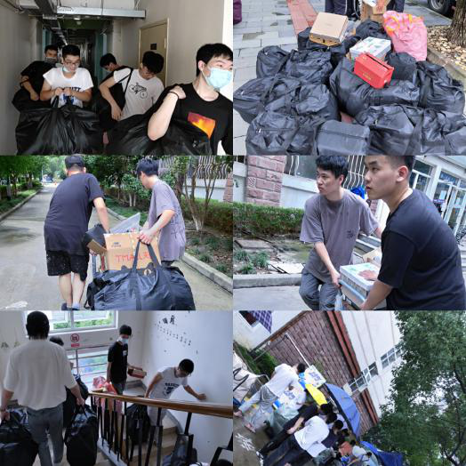 男生志愿者们帮助女生搬运重物,在大雨面前义无反顾地帮助毕业生将物品带出校外,同时也帮助未能返校的毕业生整理房间、打包并邮寄个人物品,不停地往返快递点和高层寝室,他们的衣服早已被汗水和雨水浸透,但他们志愿步伐风雨无阻!