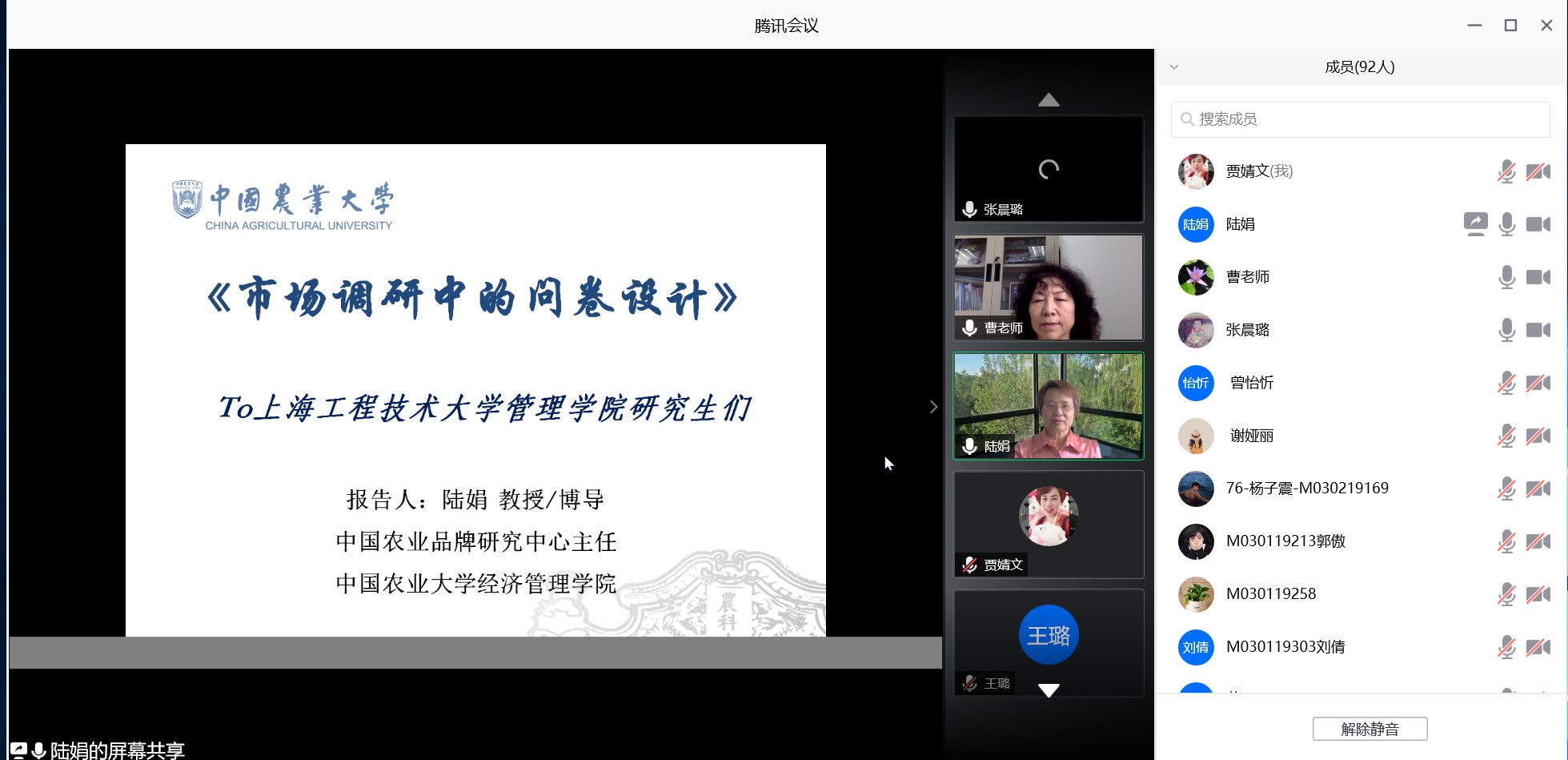 6月23日下午,管理学院举办了“市场调研中的问卷设计”线上专题讲座,讲座由中国农业大学经济管理学院陆娟教授主讲,共吸引包括我校教师、研究生、本科生在内的近200人在线参加,讲座由管理学院曹海敏教授主持。陆娟教授,中国农业大学经济管理学院教授、博士生导师,中国农业大学中国农业品牌研究中心主任,中国农业大学营销学科带头人。先后主持与参加国家重大科技项目、国家自然科学基金项目、教育部人文社会科研项目、现代产业技术体系北京市创新团队产业经济研究、农业农村部农业组织创新与产业融合发展项目等课题20多项。