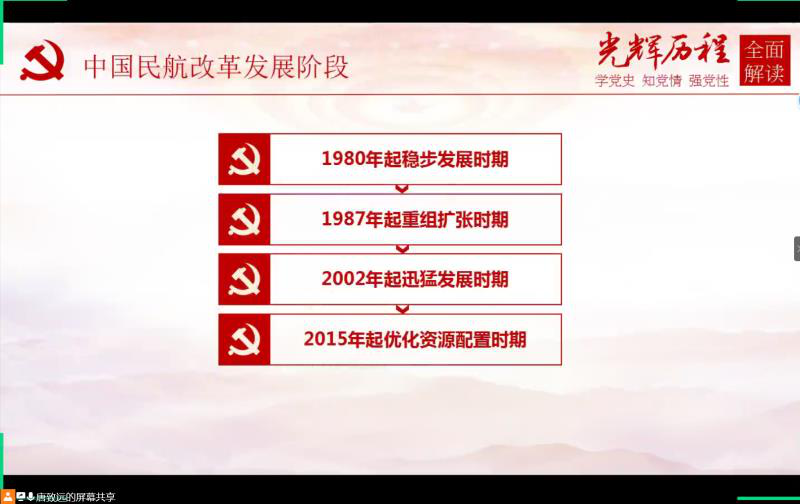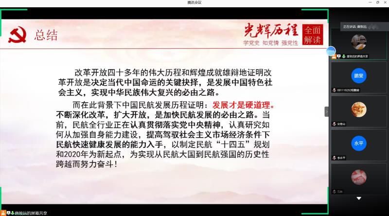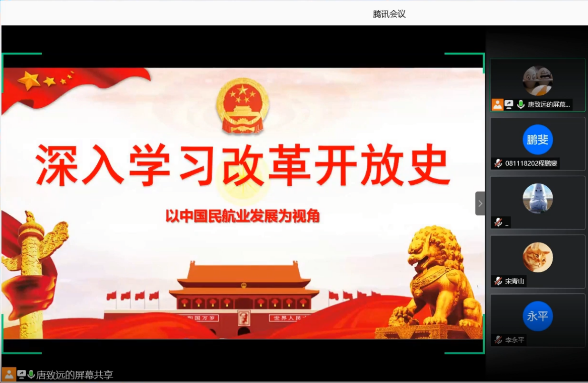 为了深入贯彻习近平新时代中国特色社会主义思想,学习党史、新中国史、改革开放史和社会主义发展史,6月19日下午,航空运输学院(飞行学院)学生创新实验室党支部开展“四史”学习教育专题党课。支部书记唐致远带领支部党员师生以中国民航业发展为视角,深入学习改革开放史。