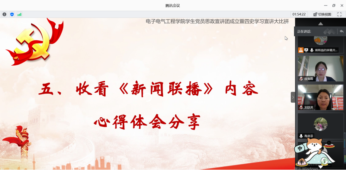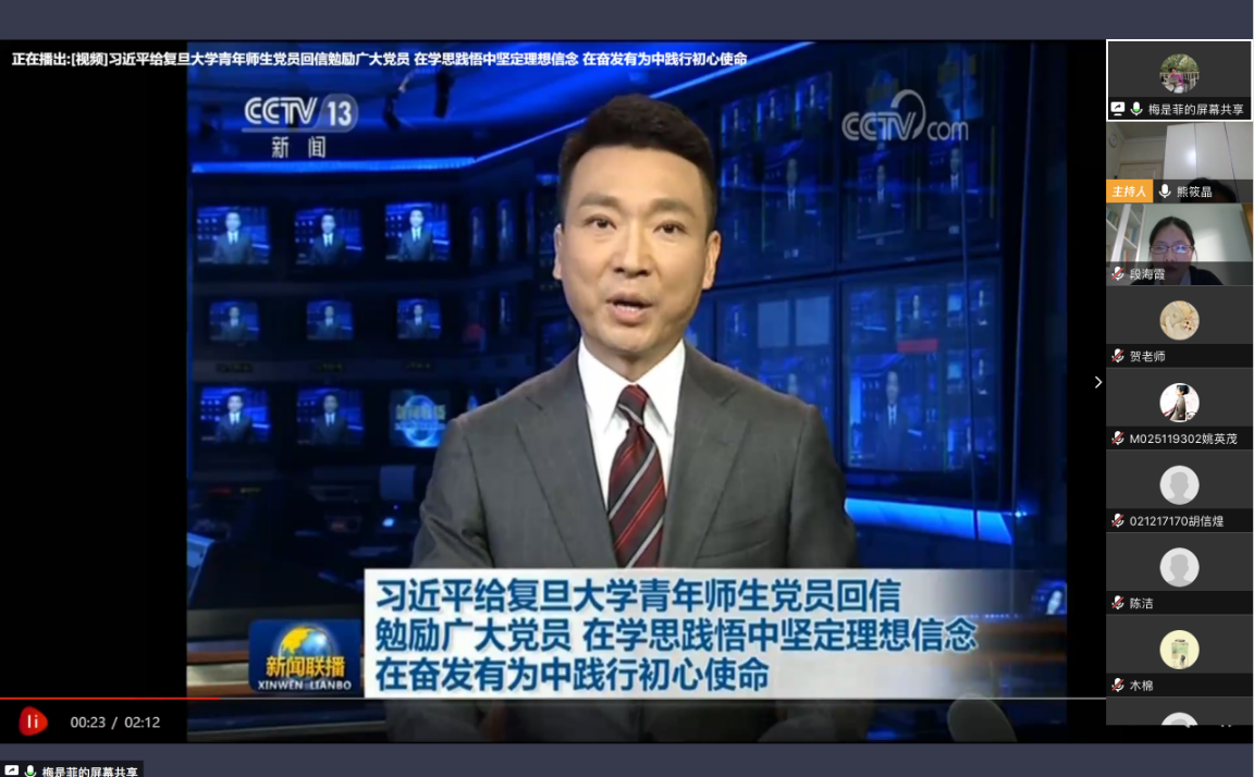 最后全体参会成员共同学习了新闻联播中习近平总书记给复旦大学青年师生党员回信,勉励广大党员在学思践悟中坚定理想信念,在奋发有为中践行初心使命的内容。学生党员思政宣讲团成员就新闻联播内容进行了讨论交流,分享了学习体会。