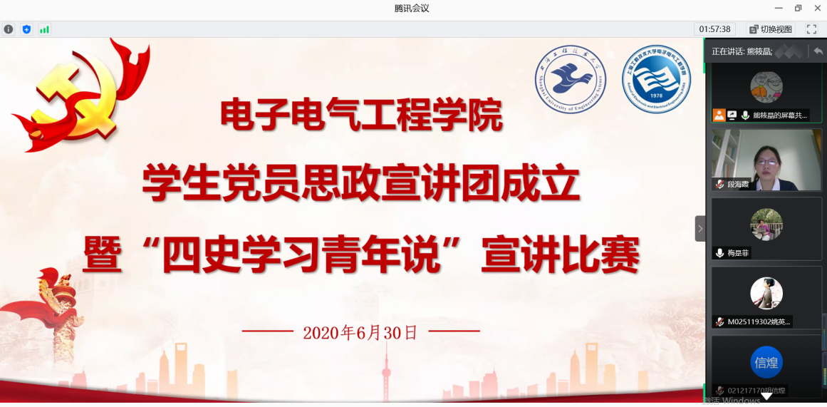 在中国共产党建党99周年来临之际,为深入贯彻落实习近平总书记有关开展党史、新中国史、改革开放史、社会主义发展史学习教育的重要讲话精神,建立健全“不忘初心、牢记使命”主题教育的长效机制,6月30日晚,电子电气工程学院开展学生党员思政宣讲团成立暨“四史学习青年说”宣讲比赛。电子电气工程学院党委书记段海霞莅临指导,电子电气工程学院党委副书记熊筱晶主持会议。学院全体学生党支部支部书记、学工办全体辅导员、党员学生代表参加此次活动。
