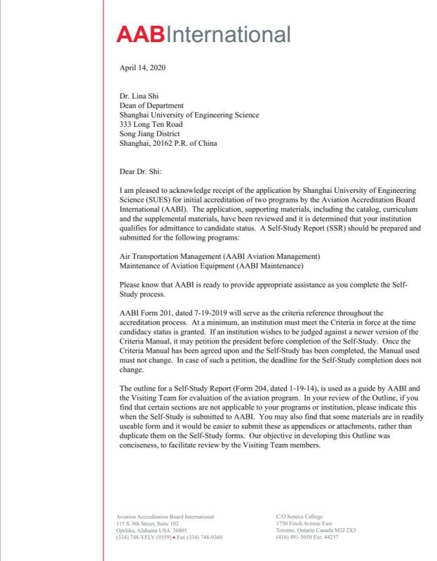 近日,航空运输学院(飞行学院)收到国际航空认证委员会(AABI, Aviation Accreditation Board International)的确认函,我校航空运输学院交通管理专业、飞行器制造工程专业国际航空专业认证申请被国际航空认证委员会正式受理。