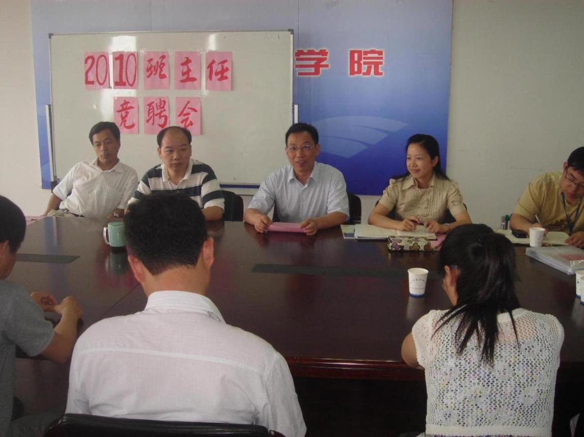 |  7月6日中午,根据校学生处《关于做好新生班主任(导师)选拔、聘任和培训工作的通知》精神,机械工程学院在行政楼1212会议室召开了2010级新生班主任竞聘会。学院党总支书记姚黎明、副院长何法江、张敏良,党总支副书记朱蓓以及全体辅导员老师参加了竞聘会,学院九名专业教师参与了新生班主任的竞聘。在这九名教师中,有七位老师拥有博士或以上学历,有三位老师曾在海外留学,有五位老师从事过班主任或辅导员工作,可谓人才济济。 竞聘会开始后,九位老师分别结合自身的工作经验和特色发表了自己的应聘理由和班主任工作设想。随后,学院党总支书记姚黎明发表了热情洋溢的讲话。他在讲话中肯定了各位老师对学院学生工作的支持和对学生的热爱之情。他指出了主任工作是一项系统工程,是把学生德、才、劳等因素集合在一起的重要工作,他希望所有老师能本着对学生的爱做好这项工作。 紧接着,副院长何法江、张敏良老师从具体的日常工作的角度和大学生科技创新活动角度对新生班主任工作提出了一些要求和希望。 最后,朱蓓副书记对广大专业教师的积极竞聘表示感谢。她表示学院党政联席会议将尽快决定新生班主任名单,并且在放假前做好新生班主任培训工作。