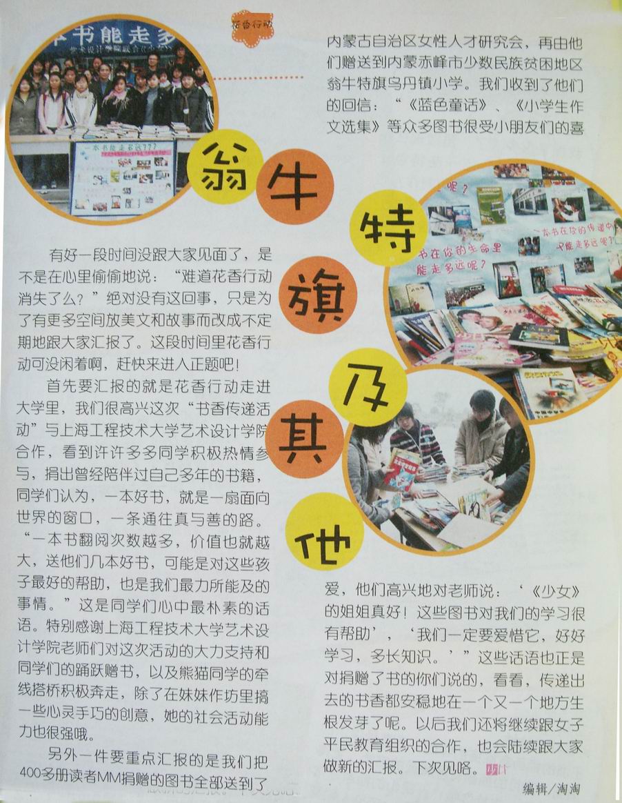 | 艺术设计学院联合上海人民出版社《少女》杂志举办的“一本书能走多远?”的读书节活动。 一本书在你眼里能走多远? 一本书在你心里能走多远? 一本书在一个人的生命历程中又能走多远? 或许在每个人心里都会给出不同的答案,经过四个多月的旅程,我校艺术学院所捐赠的书到达了偏远的山西山区,来到了那些渴望读书,渴望知识的孩子们手里。经过信息的回馈,在今年5月份的《少女》杂志上刊登了本次活动的进展情况,以及山区孩童对我校捐赠图书的老师及同学们的感谢之情,“送人玫瑰,手有余香”,我们的书香也在传递中散发出了持久的馨香。希望这些包含了浓浓爱意与温情的花香能越走越远,也希望越来越多的人加入我们的“书香传递”,让这份花香温暖每个人的心灵。不论是给予还是接受,我们都一样富足,因为我们有爱在心中。 学生记者:马丽敏 |