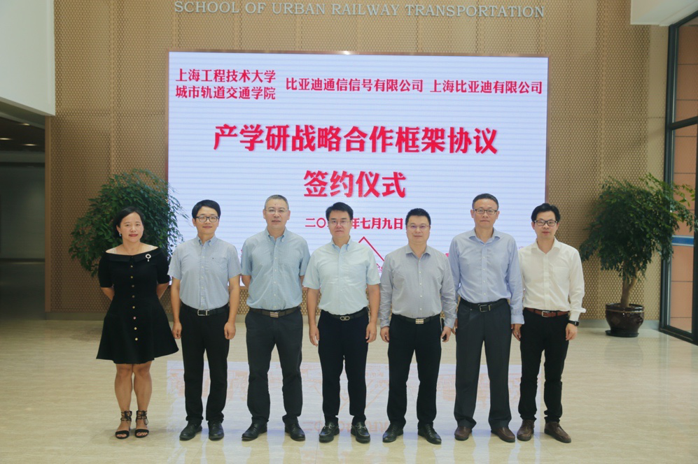 近期,城市轨道交通学院与比亚迪通信信号有限公司、上海比亚迪有限公司产学研合作签约仪式在现代交通工程中心8A521会议室举行。比亚迪通号总经理刘伟华,比亚迪股份总裁办公室总监、上海比亚迪有限公司党委书记周晓州,通号华东区总经理郑红英,战略发展总监雷亚兰,技术发展总监付珍,政府事务主任赵双阳,城市轨道交通学院党委书记柴晓冬,党委副书记、院长刘志钢,党委副书记盛知恒,副院长何越磊、郑树彬等出席签约仪式。会议由学院党委副书记盛知恒主持。