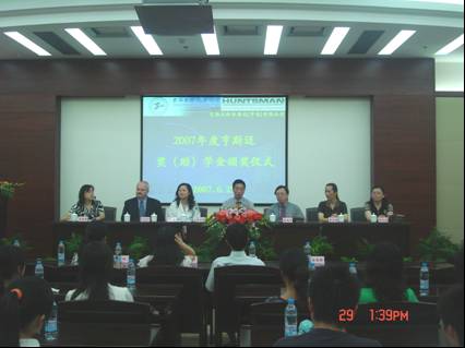 | 2007年6月29日下午,学校在图书馆第三报告厅隆重举行了2006年度亨斯迈奖(助)学金颁奖仪式。副校长陈力华、化学化工学院总支书记董义明、院长陈思浩、学生处黄文洁老师出席了颁奖典礼,仪式由总支副书记茅红柳老师主持。 亨斯迈纺织染化(中国)有限公司作为全球纺织行业的领导者,拥有完备的全球化生产、研发、销售和技术服务网络,网点遍及全球80多个国家和地区。该公司热心社会公益事业,向包括我校在内的许多大学投入了巨大资金来设立奖学金,为促进大学生的成长与发展做出了积极而有益的贡献。 欢迎仪式开始后,陈力华副校长首先向与会的领导和嘉宾致欢迎辞,并向亨斯迈公司表示了感谢,同时鼓励在座的同学们勤奋学习,用优异的成绩回报社会。亨斯迈公司上海/江苏地区总经理柯希女士向大家介绍了设立该奖(助)学金的目的和意义,宣布了获奖学生名单,并颁发了荣誉证书和奖金。最后,化学化工学院院长陈思浩教授作了热情洋溢的讲话。 颁奖仪式结束后,亨斯迈公司的负责人为在座的师生作了学术讲座并进行了互动交流。 黄中子 |