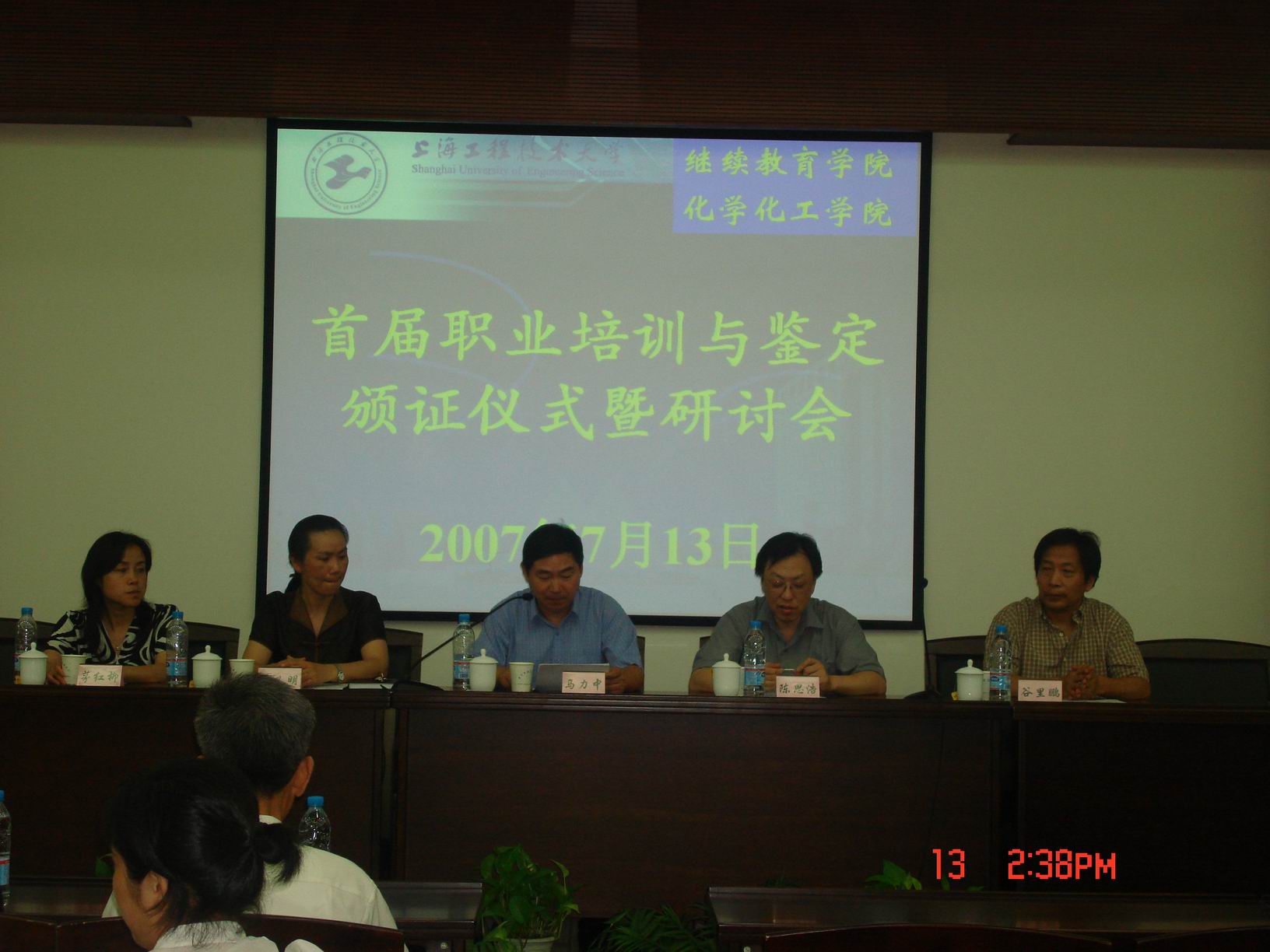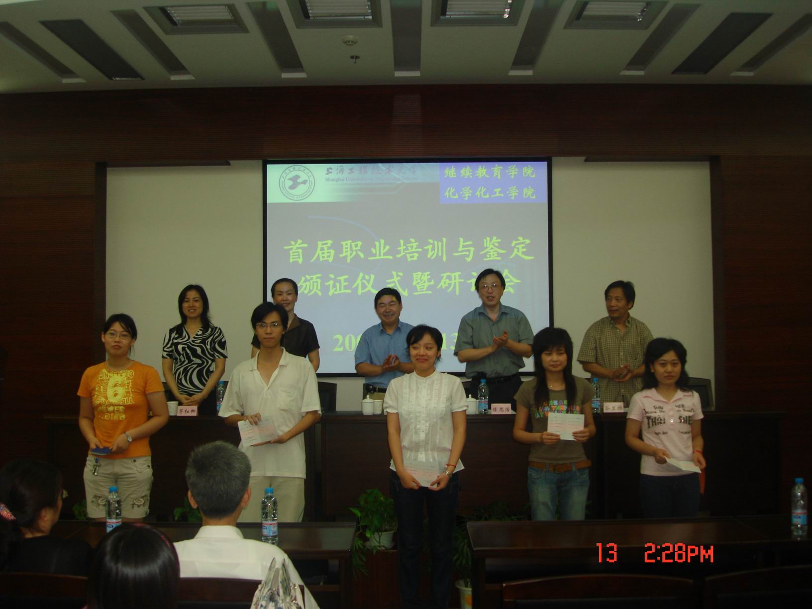 |  上午刚领取毕业证学位证,下午又能领取职业技能证书。这是化学化工学院大四部分学生在7月13日所经历的喜悦。当天下午14:00,化学化工学院首届技能培训与鉴定颁证仪式在图文信息中心第三报告厅举行。 会上,化学化工学院陈思浩院长代表化学化工学院感谢学校与继续教育学院的支持与帮助,并回顾了职业技能培训从筹备到开展的历程:化学化工学院积极贯彻学校培养应用型人才的人才培养模式,在2006年着手学历教育与职业教育相结合的人才培养模式的实践,并分别组织了化学分析工、废水处理工两个职业的培训与鉴定,并积极开展职业培训鉴定工作,向上海市劳动与社会保障局申报了化学分析工鉴定所。 继续教育学院马力中院长参加了仪式并作了讲话,肯定了化学化工学院在职业技能培训方面的突破与取得的成绩。获证学生代表张佳华、教师代表张华分别就职业技能培训对学生能力的提高与本科教学的促进作了发言。颁证仪式上,共有29名同学获得化学分析工中级证书,36名同学获废水处理工中级证书。