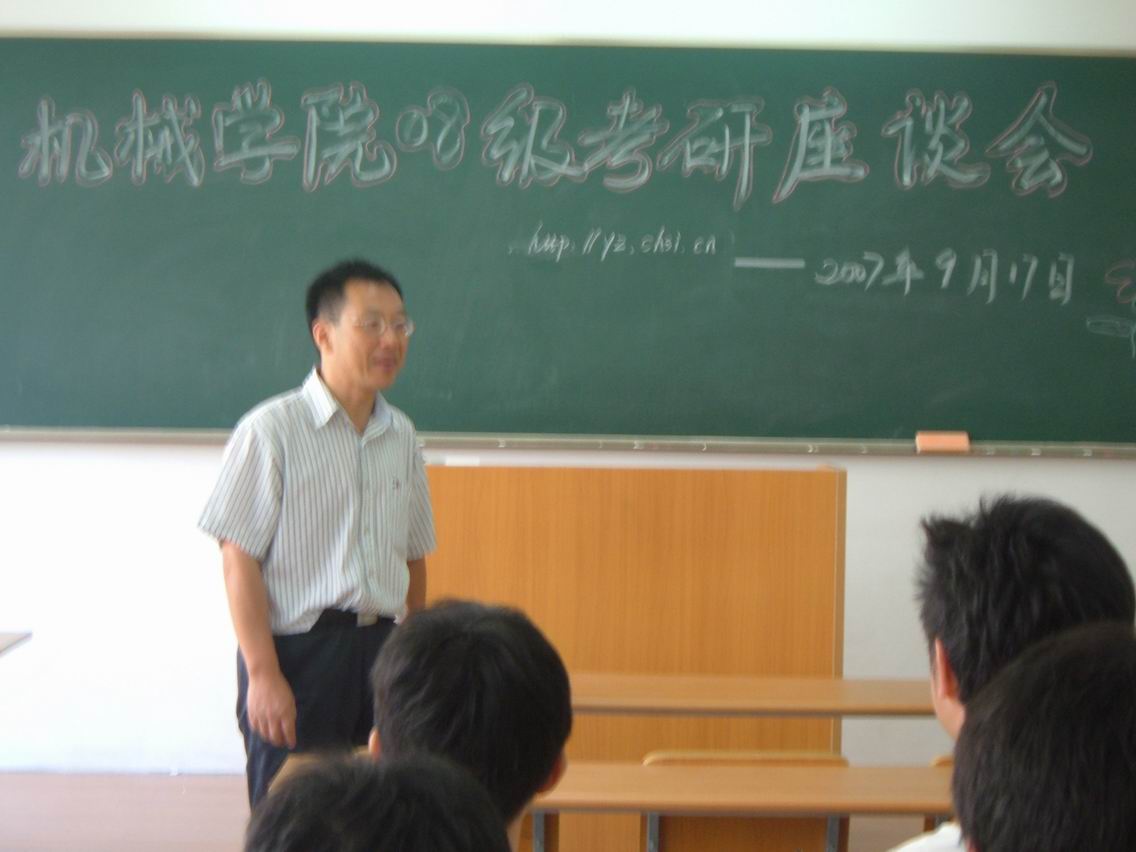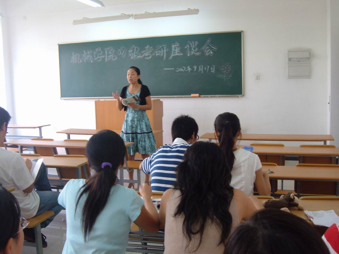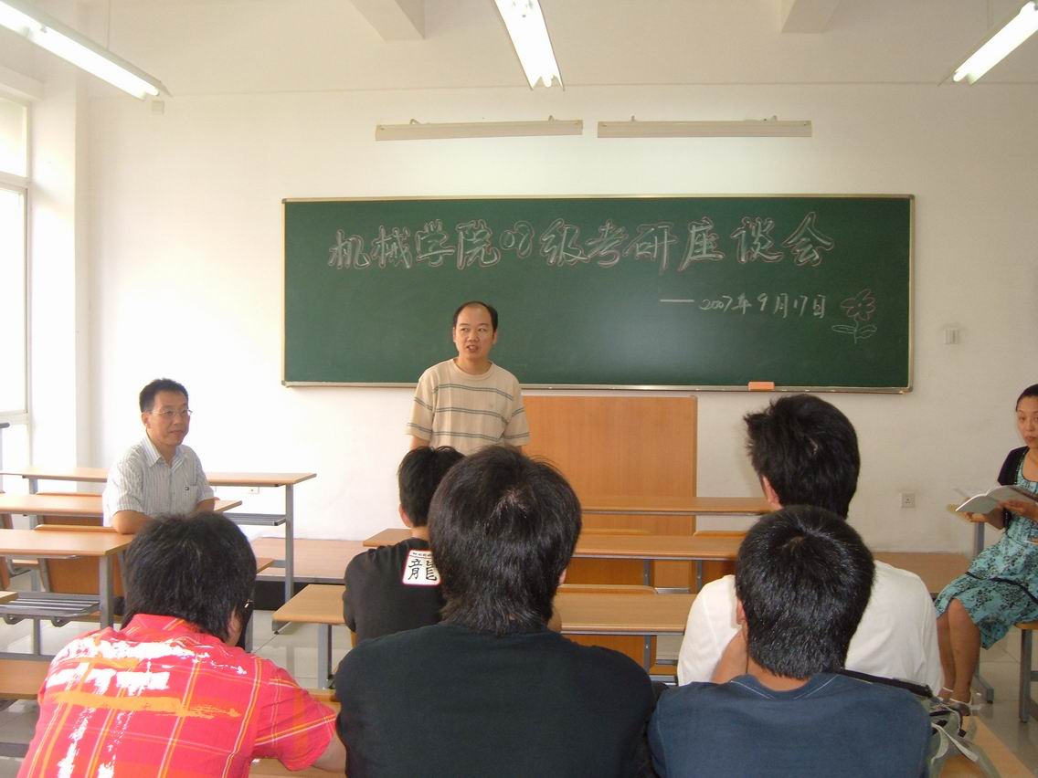 |  2007 年9月17日,机械工程学院在教学楼C106召开08年考研学生座谈会。学院党总支书记姚黎明、教学副院长何法江等学院主要党政领导和13名准备报考研究生的2008届毕业生出席了会议。会议由学院党总支副书记虞蓉老师主持。 首先,何法江副院长对广大同学能积极报名参加研究生招生考试表示肯定并就学院有关考研生的政策进行了宣传。 随后,虞蓉副书记向同学们详细介绍了今年的研究生招生政策、学校招生情况并传达了学校研究生招生会议的一些情况。虞蓉老师鼓励广大同学积极报考我校的研究生。 最后,学院党总支书记姚黎明代表学院党政领导发表了热情洋溢的讲话。他在讲话中希望广大同学能正确处理好考研和学业的关系,抓紧时间复习迎考。他也预祝广大同学能在一月份的考试中取得成功! 赵晔煚 |