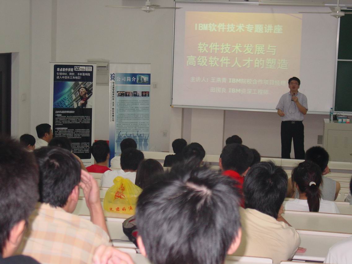 | 2007年9月27日晚,,电子电气工程学院邀请了IBM资深软件工程师和IBM院校合作部的领导来校开办“软件技术的发展与高级软件人才的塑造”的专题讲座。讲座由计算机系副主任黄润才老师主持,参加讲座的学生有近百人,主要是计算机科学与技术专业的高年级学生。  活动中,电子电气工程学院计算机系副主任黄润才老师介绍了主要的来宾,并代表学院对各位来宾表示了热烈的欢迎。随后,IBM资深软件工程师田国良博士就软件技术的发展进行了介绍,他主要围绕J2EE开发平台和IBM E-business system的若干技术问题展开,先后介绍了DB2、WebSphere、Lotus、Rational等软件体系,并结合自己的成长历程,就软件高级技术人才培养谈了自己的看法。田博士生动的讲述,吸引在场同学的极大兴趣。最后,IBM院校合作部经理王燕青女士就IBM软件技术人才的素质和培养要求进行了细致的分析,并结合目前软件技术人才的需求,对在校大学生提出了适当的要求,得到了现场同学们的热情响应和热烈掌声。 讲座在活跃的气氛中进行,交互频繁,谈论深入,同学们一致认为很有收获,并希望这样的讲座今后能经常举办。 黄润才 刘婧峥 |