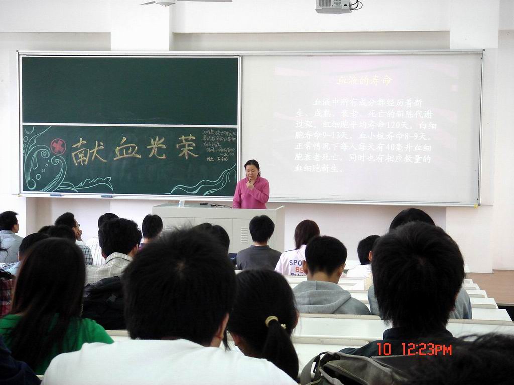 2007年10月10日中午12:00,电子电气工程学院在教学楼F120举行了“献血光荣”献血动员会。校医务室张医生为学生们讲解了献血的作用及中国无偿献血制度。