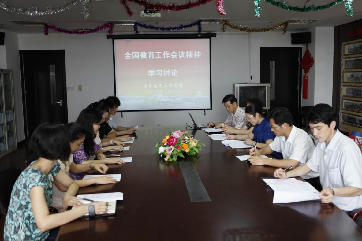 |  7月15日下午,电子电气工程学院在行政楼912会议室召开全国教育工作会议精神学习讨论会。学院党总支书记茅蕾、副院长张莉萍、党总支副书记王东阳等学院领导出席会议,学院院长办公室和学生工作办公室全体教师参与了讨论。会议由茅蕾书记主持。 副院长张莉萍在会上指出,胡锦涛总书记和温家宝总理在全国教育工作会议上发表的重要讲话,描绘了未来10年我国教育改革发展的宏伟蓝图,强调了科教兴国、人才强国的战略。作为教育工作者,感到非常激动和振奋,同时也感到了肩负的责任和压力。面对激烈的全球竞争,人才是竞争的关键。高等院校是人才培养的摇篮,上海工程技术大学主要培养应用型人才——卓越工程师,强调既要提高人才培养、科学研究和服务社会的能力,又要注重教学质量的提高,任重而道远。要做好这项工作,既要有全局的意识、责任感和使命感,又要脚踏实地,拼搏奋斗,抓住机遇,科学发展,从而提升学校的竞争力和影响力。 党总支书记茅蕾要求各位教师在本职工作岗位上发挥自身特长,寻找好的载体,不断培养优秀的电气信息类人才,为全国的发展做出自己的贡献。 会上,与会教师认真学习了胡锦涛总书记和温家宝总理在全国教育工作会议上发表的重要讲话,并开展了热烈的讨论。
