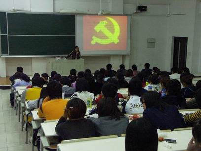 10月24日晚18:00,艺术设计学院第二党支部于教学楼C320举办以“党的基础知识和学习十七大”为专题的党课学习,参加此次学习班的共有三百五十多名同学,全都是来自大一大三入党积极分子,讲座由第二党支部书记刘蔚老师主讲。在历时近两个小时的主题党课中,刘老师系统讲解了党的性质、指导思想、纲领、宗旨以及党的组织制度和党的纪律等基础知识,并结合十七大会议精神,梳理了在新的形势下当代高校入党积极分子所应具备的基本能力和素质。党课上同学们认真听讲,不时地摘要记录,全身心地投入到了党课的学习氛围中;老师讲解绘声绘色,会场气氛热烈。此外,刘蔚老师还要求在座的同学课后紧紧围绕 “当代大学生与十七大精神”这个主题,认真思考,继续学习、领会、理解十七大精神,兴起学习、宣传、贯彻十七大精神的热潮。