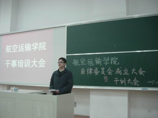 会议由学生干部主持。团学联副主席助理柳畋同学和学习部部长顾轶辉同学分别向新生干事们介绍了学校有关奖学金评定、学分管理、学籍处理和考场纪律处分的管理规定,让同学们对学校的相关制度有了详细的了解。此后,团学联海报中心组组长惠书青同学用别出心裁的英语单词——Lead,Assist,Serve,Example 和“Book of stop here”为同学们生动诠释了“怎样做一名优秀的学生干部”,让大家留下了深刻的印象,同时也让大家明白了作为学生干部是一种荣誉,但更多代表着的是一份责任。 此次干事培训为航空学院团学联新一批干事上了十分宝贵的一课。干事们是航空学院的新鲜血液,相信他们会认真领会干训的精神并传播到整个学院。