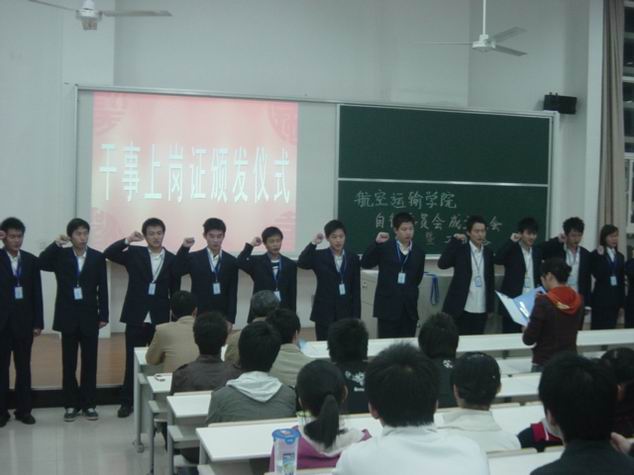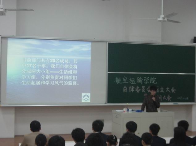 11月20日晚18:30,航空运输学院在教学楼F320举行了学院学生自律委员会成立仪式。航空运输学院党总支副书记路新生老师,分团委书记姜孟升老师,航空学院团学联所有部长、干事参加了仪式。