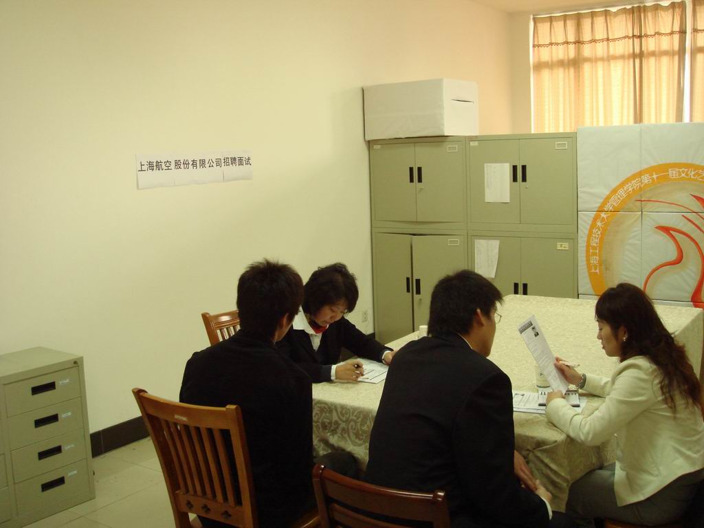 上海航空是管理学院的合作单位,每年为管理学院提供不少就业岗位。此次,上航商务部招收20名商务员,对我校市场营销、国贸等专业学生表示了浓厚的兴趣。为了抓住这次难得的契机,管理学院相关专业学生从着装搭配到发型设计,从准备简历到面试礼仪等各方面做了精心的准备。现场还有许多学生围着学院负责就业的老师寻求面试的一些建议。 除上海航空外,还有一些单位将在近期陆续在管理学院开办就业二级市场。