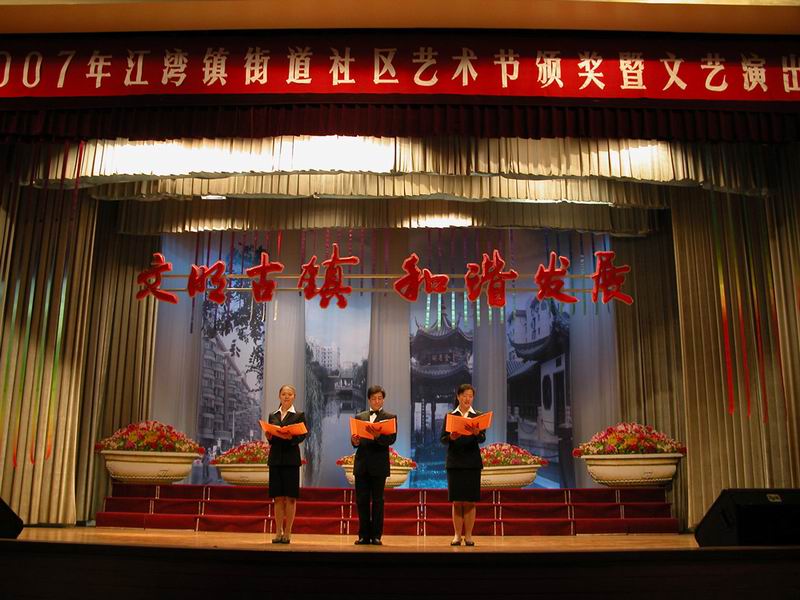 日前,虹口区江湾镇街道以“文明古镇、和谐发展”为主题,举办了2007年艺术节,在复兴高级中学举行的颁奖暨文艺演出中充分展示了社区精神文明建设的丰硕成果。高职学院沈德宝老师创作的配乐诗朗诵《美丽江湾,和谐校园》,经学院张威、梁乃刚、宫海燕三位老师深情演绎,博得全场喝彩,掌声不断。为表彰学院长期来对社区工作的支持,虹口区委宣传部和江湾镇街道特授予高职学院“优秀组织奖”奖杯一座。高职学院党总支书记柳如荣上台领奖,他表示,加强学院与社区的互动,既是创建安全文明校园的必要举措,也是构建社会主义和谐社会的实际需要,学院将一如既往、动员各方面力量做好此项工作。 沈德宝 稿件作者:沈德宝责任编辑:陈文琼