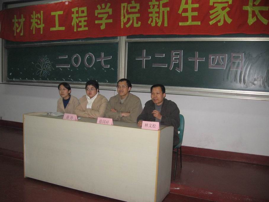 材料工程学院党总支书记徐国祥老师、副院长林文松老师、总支副书记薛玲老师等学院领导出席了此次家长会。首先,学院党总支书记徐国祥老师就学院的思想教育工作向家长们作了具体的介绍。随后,针对新生家长比较关心的教育教学工作,副院长林文松老师就期中考试的情况跟家长作了汇报,并就如何指导督促学生以更加认真的态度迎接期末考试向家长们作了动员。总支副书记薛玲老师向与会家长介绍了学院的学生工作。最后,各个班级的班主任、辅导员针对各个班级的自身情况及特点接受了家长的咨询。 到会家长纷纷表示,此次家长会加强了学院与家长之间的沟通,让家长们了解了学生的在校情况从而更好地支持学校的工作,也使家长们对学校教书育人的理念有了更深入的了解。