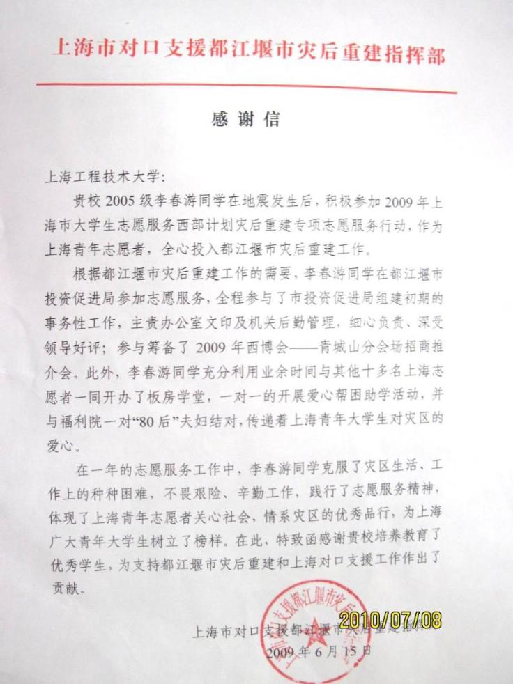 |  最近,航空运输学院收到一封来至上海对口支援部都江堰市灾后重建指挥部的表扬信,对我校航空运输学院09届毕业生李春游同学参与大学生志愿服务西部计划,在汶川地震灾区灾后重建专项志愿者服务行动中的突出表现给予了表彰。 在四川发生地震后,工程大师生与全国人民一样,奉献爱心,为灾区人民祈福,献上自己的心意。2009年航空运输学院0812051班李春游同学于毕业前夕积极报名参加上海市大学生志愿服务西部计划灾后重建专项工作,荣获批准。李春游同学作了充分的思想准备,决心亲临地震灾区,为灾区重建献上工程大学子的一份力量。 作为一名上海青年志愿者,李春游同学负责都江堰投资促进局组建初期的事务性工作,不仅各项事务细心负责,深受当地领导的好评,还充分利用业余时间积极参加帮困助学活动,传递着上海青年大学生对灾区的爱心,表现出工程大学子的奉献精神。 作为工程大的学子,大家应学习他努力践行志愿服务,克服工作上的种种困难,不畏艰险,辛勤工作的精神。 | | | 稿件作者:学院办公室 责任编辑:陈文琼