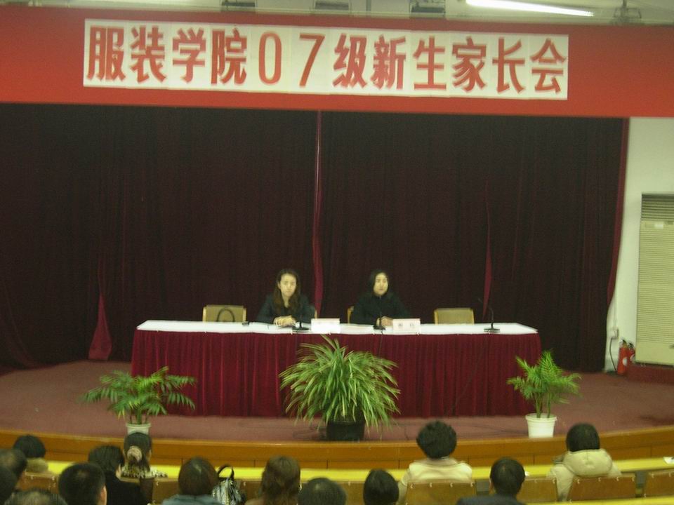 2008年1月9日周三下午18:00,服装学院于仙霞路校区演讲厅召开了学院07级新生家长会。会议由学院党总支副书记袁蓉老师主持。服装学院党总支副书记 会议首先由服装学院副院长谢红教授讲解07级新生接下来大学4年的教学情况,课程课时的安排及学籍管理等各项事宜。