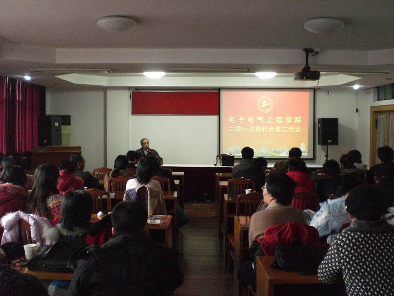 2008年1月24日下午14:00,电子电气工程学院在仙霞路行政楼525召开二届一次教代会暨工代会。会议由学院党总支书记刘国成主持,电子电气工程学院教代会代表和教职员工参加了会议。 会议首先由党总支书记刘国成作第一届教代会暨工代会换届选举工作情况汇报。随后,与会代表们举手表决一致通过电子电气工程学院第二届教代会暨工代会主席成员表名单。代表们和教职工认真听取了院长刘启中同志《电子电气工程学院2007年度工作报告》和院工会副主席卓郑安同志《院工会2005年——2007年创建先进教工小家工作》的汇报。 刘启中院长在《电子电气工程学院2007年度工作报告》中科学地总结了学院2007年教学和科研等各项工作取得的可喜的成绩和存在不足方面,并提出了加强学院内涵建设的新要求。院工会副主席卓郑安在《院工会2005年——2007年创建先进教工小家工作》报告中用多幅学院工会活动照片,总结了过去一年的院工会工作。电子电气工程学院被校评为2005-2007年优秀教工之家。 大会要求学院全体教职工要认真学习贯彻党的十七大精神,深入贯彻落实科学发展观和党的十七大对教育工作的新要求,进一步增强忧患意识和责任意识,始终保持开拓进取的锐气,刻苦学习、戒骄戒躁、艰苦奋斗,扎实工作,加强师德师风建设,着力提高教学质量,推进学科建设,为建设现代化特色大学努力奋斗。 大会号召:学院党员干部、教职工要认真学习贯彻党的十七大精神,用党的十七大精神武装头脑,用中国特色社会主义理论体系武装头脑,高举中国特色社会主义伟大旗帜,以邓小平理论和“三个代表”重要思想为指导,贯彻落实科学发展观和构建社会主义和谐社会的重大战略思想,贯彻党的教育方针,进一步统一思想,振奋精神,戒骄戒躁、艰苦奋斗,刻苦学习、埋头苦干,开拓进取、扎实工作,把培养德智体美全面发展的社会主义事业建设者和接班人作为根本任务,坚持育人为本、德育为先,全面落实立德树人的要求,加强和改进学生思想政治工作,引导学生树立正确的世界观、人生观、价值观、荣辱观,培养德智体美全面发展的社会主义建设者和接班人,为努力落实、完成《学院教育事业发展“十一五”规划》实现学院新的发展、建设现代化特色大学更加灿烂美好的2008年作出更大的贡献,为实现党的十七大确定的目标和任务而努力奋斗。 大会最后,党总支书记刘国成宣读电子电气工程学院第二届一次教代会决议,并举手表决一致通过。会议在祥和的气氛中落下帷幕。