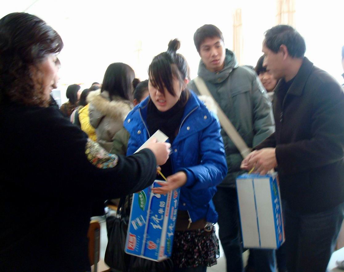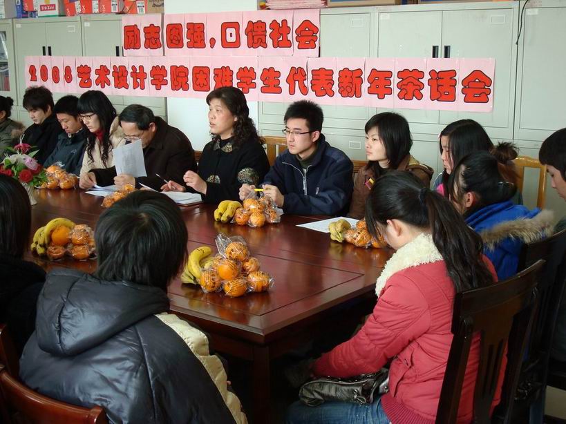 茶话会充满了真情、关爱和自强的气氛,学生工作办 茶话会结束时,潘惠德老师等还把代表学院关爱的牛奶、洗发水等生活用品发放到困难学生代表的手上,同学们声声道谢!