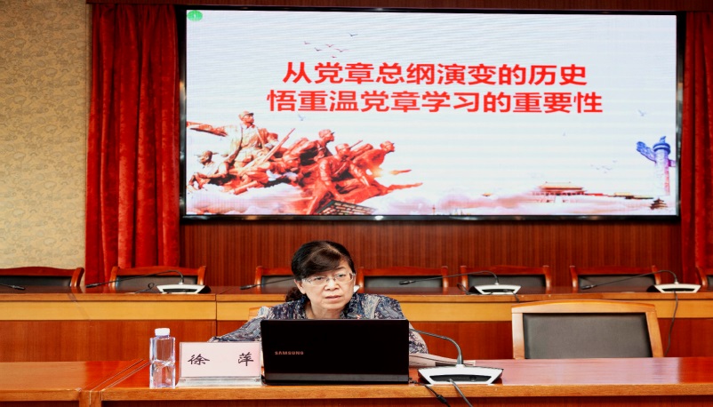 学院、校党委委员徐萍为学院、校全体中层以上干部做了题为《从党章总纲演变的历史悟重温党章学习的重要性》的专题讲座。徐老师详细梳理了党章总纲演变的历史脉络,对党章总纲演变的深刻内涵进行了透彻解读,并结合新冠疫情防控及当前国内外局势等社会热点,生动诠释了党章作为党的根本大法的重要地位。她带领全体干部重温党章,从中汲取提高思维品质的智慧和奋发有为的力量。