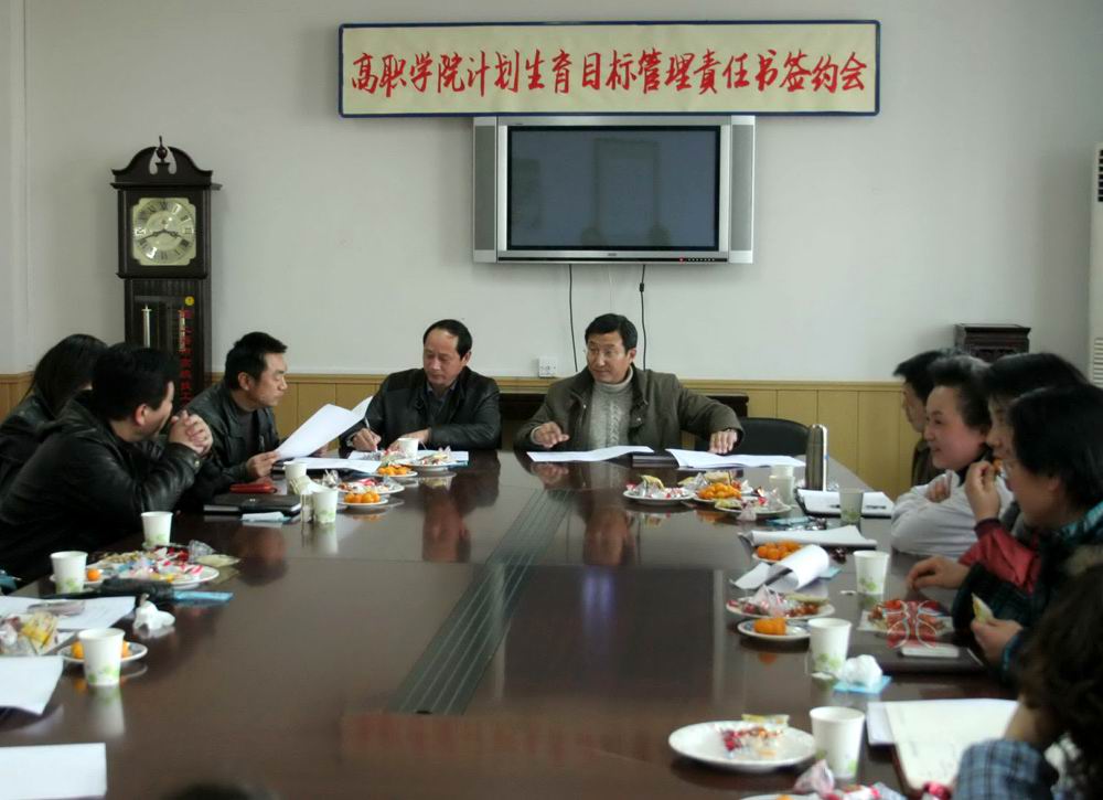 3月5日下午,高职学院2008年计划生育目标管理责任书签约会在综合大楼811会议室举行,院分管领导田盈耕副院长及8个部门党支部书记、工会女工委员出席会议。 学院计生工作小组秘书长刘建萍在会上总结了2007年度的计生工作情况。目前全院共有女职工160人,其中新进女职工未婚9人,已婚9人,生育5人,计划生育率为100%,晚婚晚育率为100%,人流率为零,无计划外生育(含外来人口),较好地完成了年初学院与江湾镇街道签订的目标责任书所要求的各项任务。她将成绩的取得主要归结为:领导重视,网络健全;宣传到位,认识提高;关心重点,提供服务;定期体检,保障健康。