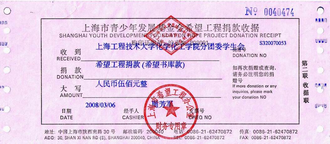 近日,化学化工学院分团委、学生会收到了来自上海市希望工程办公室、上海市爱心助学办公室的捐款收据。在去年年底的读书节活动中,学院分团委、学生会的学生以图书义卖形式募得善款500元,如数捐给上海市青少年发展基金会用做希望书库的建设款项。参与图书义卖和捐款活动的同学纷纷表示这种有意义的活动不仅使得同学们的能力有所提升,将活动款项悉数捐赠更是体现了化学化工学院学生的爱心。他们会一如既往的将爱心在各方面延续下去。 王佳杰 稿件作者:王佳杰责任编辑:陈文琼