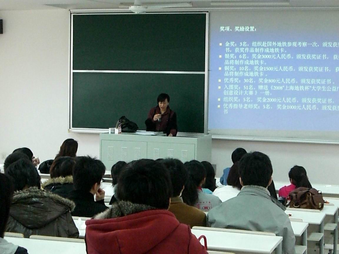 |  4月16日,上海申通地铁公司文化创意部负责人在教学楼F206为我校艺术设计学院、服装学院学生开展了主题为“创意、梦想、今天放飞”——“上海地铁杯”大学生公益广告创意设计大赛专题讲座。本次讲座内容主要分为三个方面,分别从对世界各国地铁文化的介绍、欣赏一些曾在上海地铁内展出过的作品及就“地铁里的公益广告—2008年‘上海地铁杯’大学生公益广告创意设计大赛”的相关参赛事宜进行详细说明和答疑。讲座历时一个小时,雷经理以其精彩的演讲博得了同学们的阵阵掌声。整个讲座中同学们认真记录笔记并踊跃的发表意见,现场气氛非常融洽。 |
