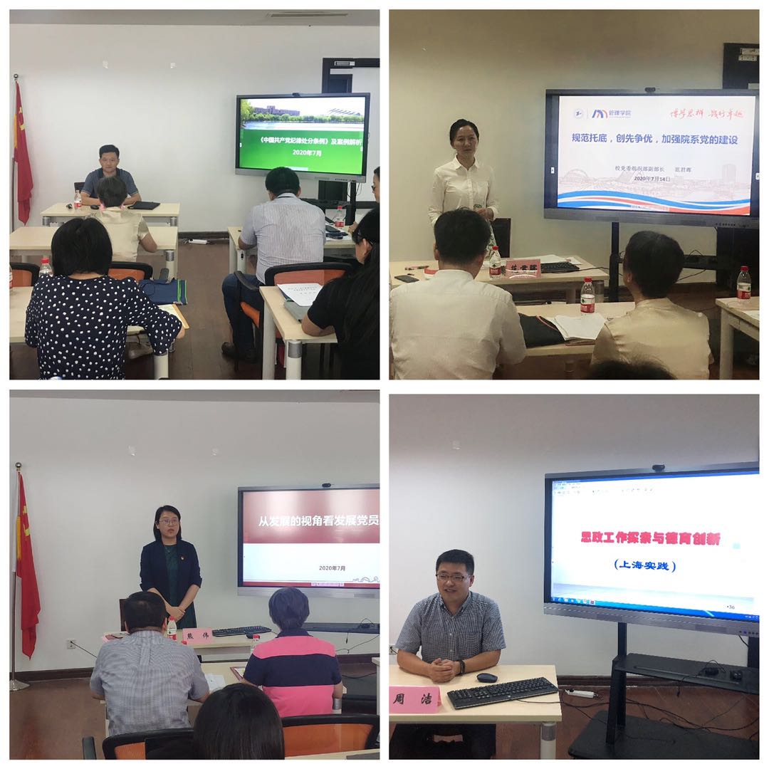 培训中还邀请到了校纪委纪检员梅运笋老师作《以案明纪—<中国共产党纪律处分条例>及案例解析》,梅老师从鲜明的案例出发为老师们讲解了《条例》为什么修改、做了哪些修改,以案明纪,深入解读了党员干部必须坚守的纪律“底线”,号召大家做一名讲政治、有信念;讲规矩、有纪律;讲道德、有品行的合格干部。校党委组织部副部长范君晖老师作了《规范托底、创先争优、加强院系党的建设》的报告,范老师从相关工作背景和要求、学院层面议事规则、院系党建“1+2”文件3个方面对如何规范基层党组织工作建设作出了详细的解读。校党委组织员熊伟老师作了《从发展的角度看发展党员工作》报告,用非常生动详实的案例为老师们解读了党员发展工作的理论及实践,为老师们充分学习党员发展工作的规范性、优化党员发展结构、提高发展党员质量作了系统的培训。