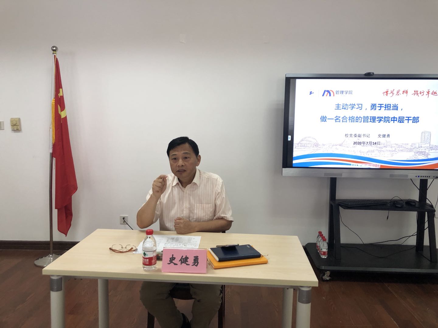 校党委副书记史健勇老师作培训首讲《如何做好一名中层干部》。史健勇老师从什么是中层干部、如何做好中层干部、如何当好管理学院的中层干部三个层面,为老师们解读了如何培养和锻炼中层干部的理论素养、决策水平和履职能力。史健勇老师从丰富的干部培养经验以及管理学的角度出发,讲述了学校中层干部的行为、准则、定位,明确高校为党育人、为国育才的使命;如何理解中层干部的思想认识、工作方法、使命当担,紧紧围绕学校及学院的中心工作积极履职;中层干部应当找准位、定好位、做到位,提升辨别、学习、创新、自律、实践、沟通能力,强化大局、责任、危机、绩效、团队、公仆意识;提出了管理学院中层干部在教学、科研、师资队伍建设、学科建设、学生培养等多方面的管理要求。史健勇老师指出,新时代新发展需要不断提高干部队伍的能力及素养,希望参训学员珍惜学习机会,带着问题认真学习,结合实践多思多想,学以致用,推动工作,真正实现学有所获、学有所长,确保培训取得实效。