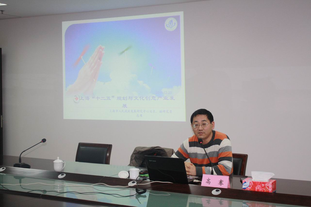 |  12月20日下午,应我校管理学院邀请,上海市人民政府发展研究中心发展处处长高骞教授在校行政楼“政府公共决策支持”研究基地会议室为我校师生作了“上海‘十二五’规划与文化创意产业发展”的专题报告。报告会由管理学院常务副院长主持,管理学院和社会科学学院的相关领导、两院的全体教师及研究生参加了此次学术报告。 高处长以上海“十二五”规划为背景,重点针对上海文化创意产业的促进与发展,进行了详细而又精彩的解读与分析。报告内容涉及上海“十二五”规划的制定背景、主线与目标、战略重点及上海文化创意产业的发展现状与趋势、发展目标、环境评估、空间布局与对策建议等。 近些年,文化创意产业被提升到国家战略的阶段,其发展关系着国家与地方经济的转型与发展。高处长的报告为我校师生提供了深层次接触文化创意产业的机会,加强了对上海未来五年的建设重点与发展态势的把握,并对我校相关人文社会学科的发展起到了积极的促进作用。