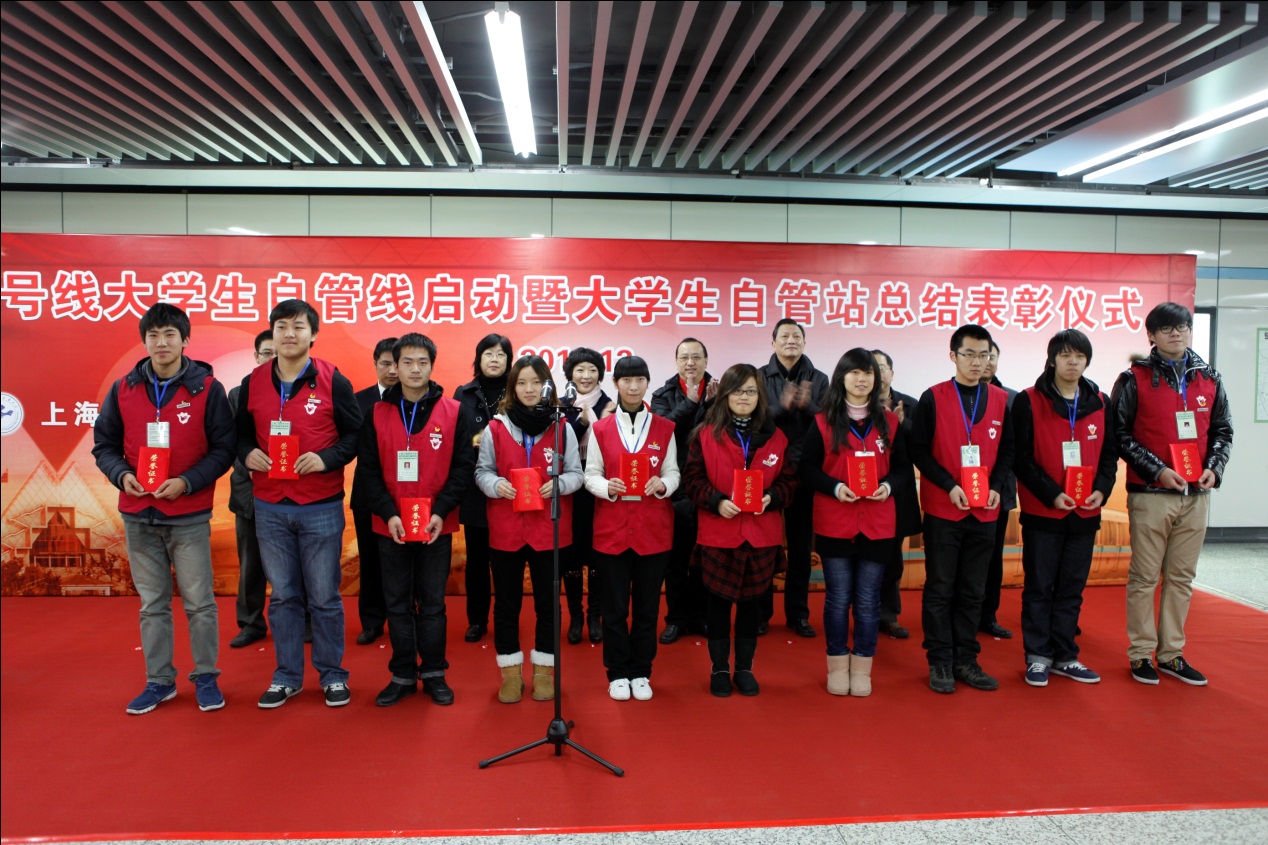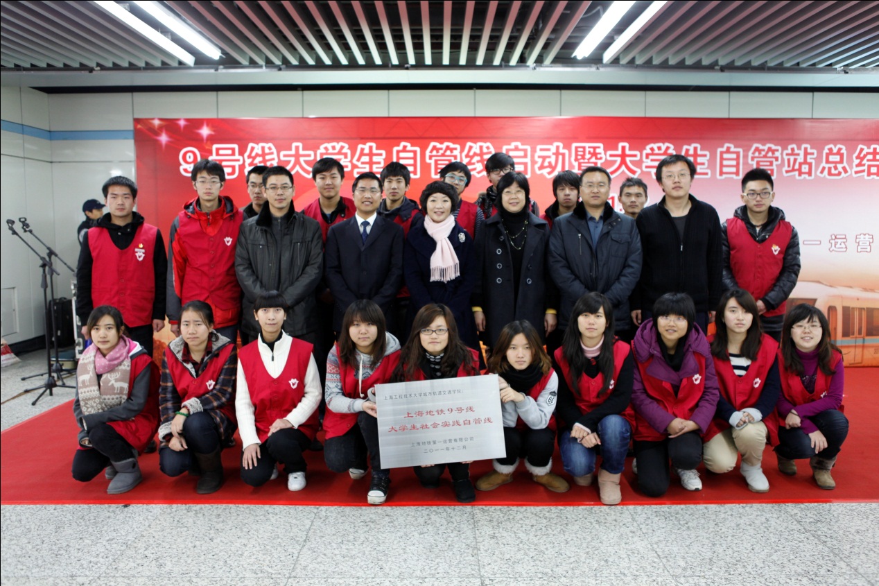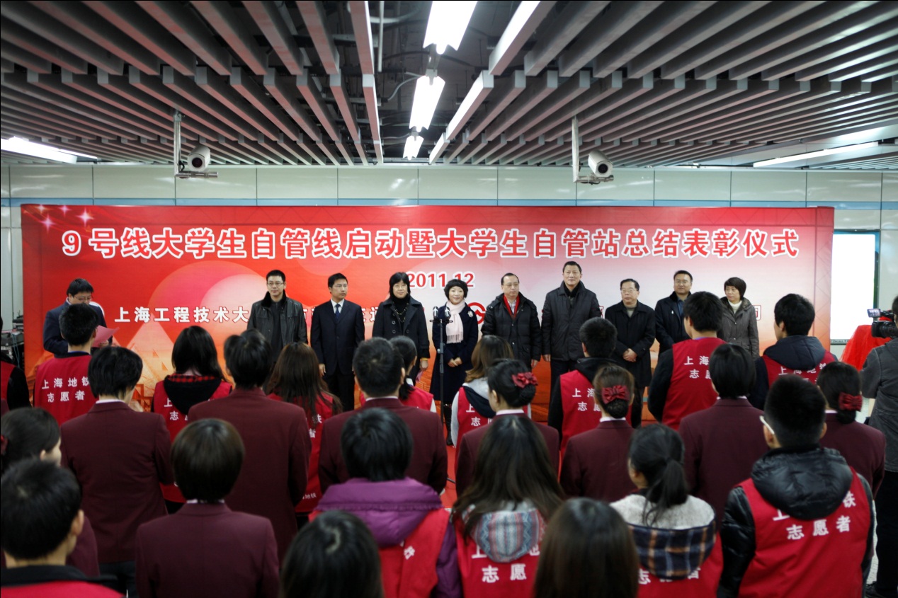 | 12月23日上午,“9号线大学生自管线启动暨大学生自管站总结表彰仪式” 在上海地铁9号线徐家汇站厅举行。上海地铁第一运营有限公司党委蔡洪宇、上海工程技术大学城市轨道交通学院党总支书记缪行外、上海工程技术大学宣传部部长王一川、申通地铁集团党办副主任吴昕毅、上海工程技术大学组织部副部长朱洪春、上海地铁客运一分公司运安部经理孙克晴等出席了启动仪式。  9号线徐家汇站举行了大学生自管线启动暨大学生自管站总结表彰仪式 大学生自管员不同于在地铁车站内维护秩序的志愿者,他们更是专业的地铁服务员、督导员,甚至值班站长,他们能像一般的地铁员工一样参与地铁的日常运营管理,甚至可以跟普通的值班站长一样处理乘客的投诉。自2009年6月“9号线大学生自管站”启动以来,上千名大学生在“自管站”这个平台上,拓宽了大学生的专业视野,提高了创新意识和创新能力。 上海地铁客运一分公司运安部经理孙克晴宣布了优秀地铁自管站志愿者的表彰决定。全体领导为大学生志愿者代表颁发了证书。同时,上海工程技术大学城市轨道交通学院聘请了10位“地铁人”作为青年教师和大学生导员的“职业导航——党员导师”,帮助他们坚定理想信念、增强党性修养。上海工程技术大学组织部副部长朱洪春宣布了党员导师聘任名单,上海工程技术大学宣传部部长王一川与申通地铁集团党办副主任吴昕毅共同为“9号线大学生自管线”揭牌。