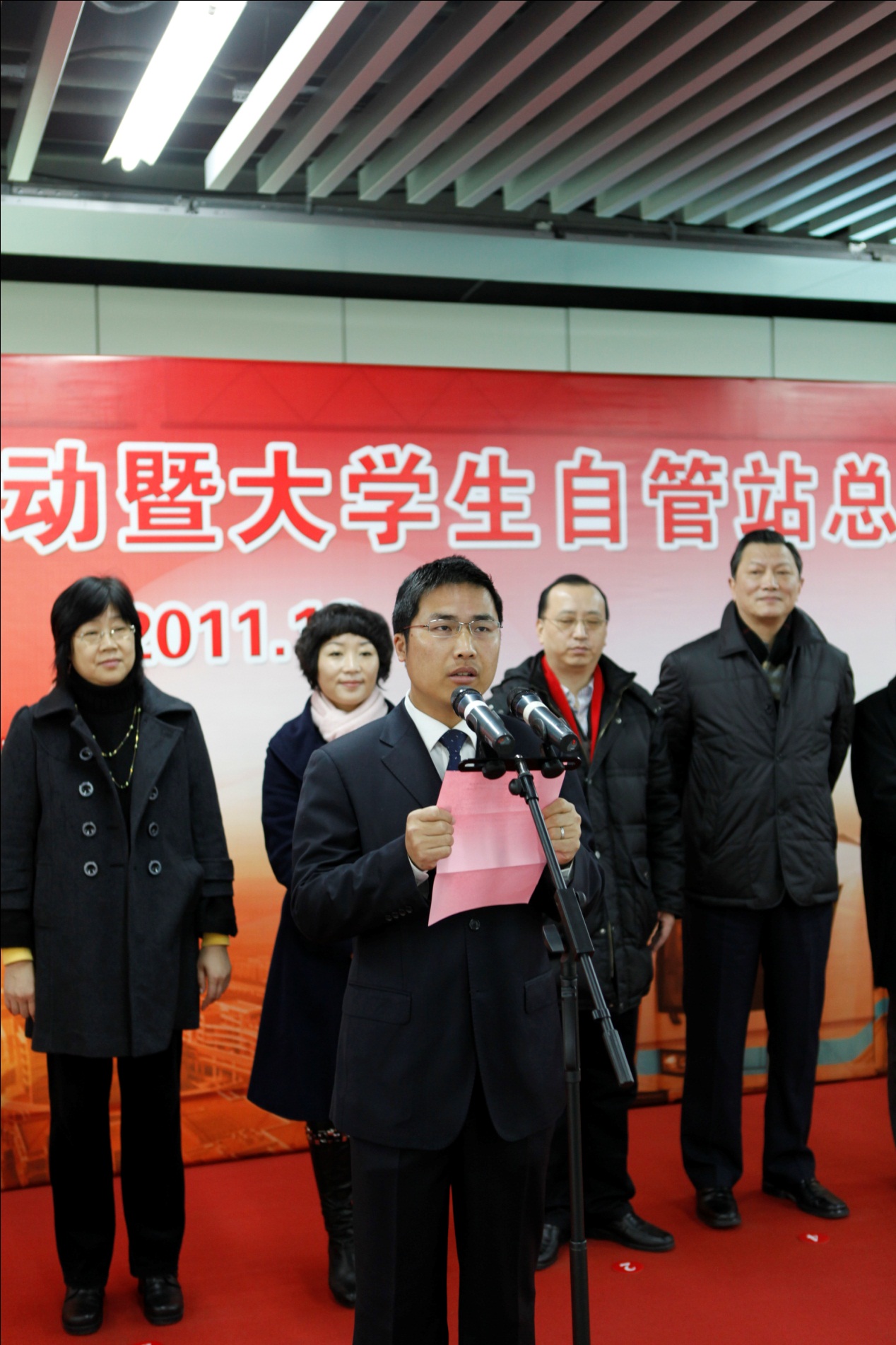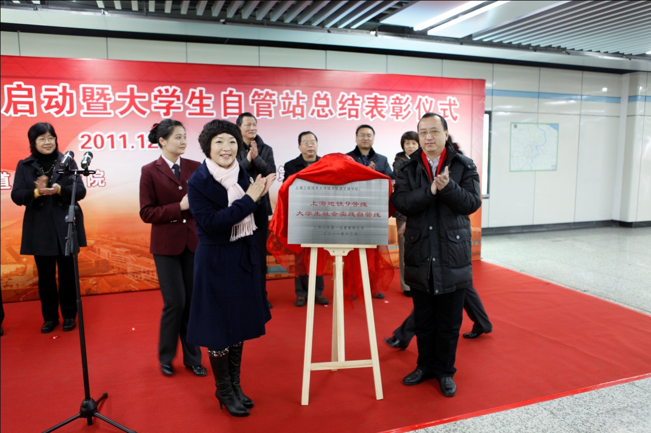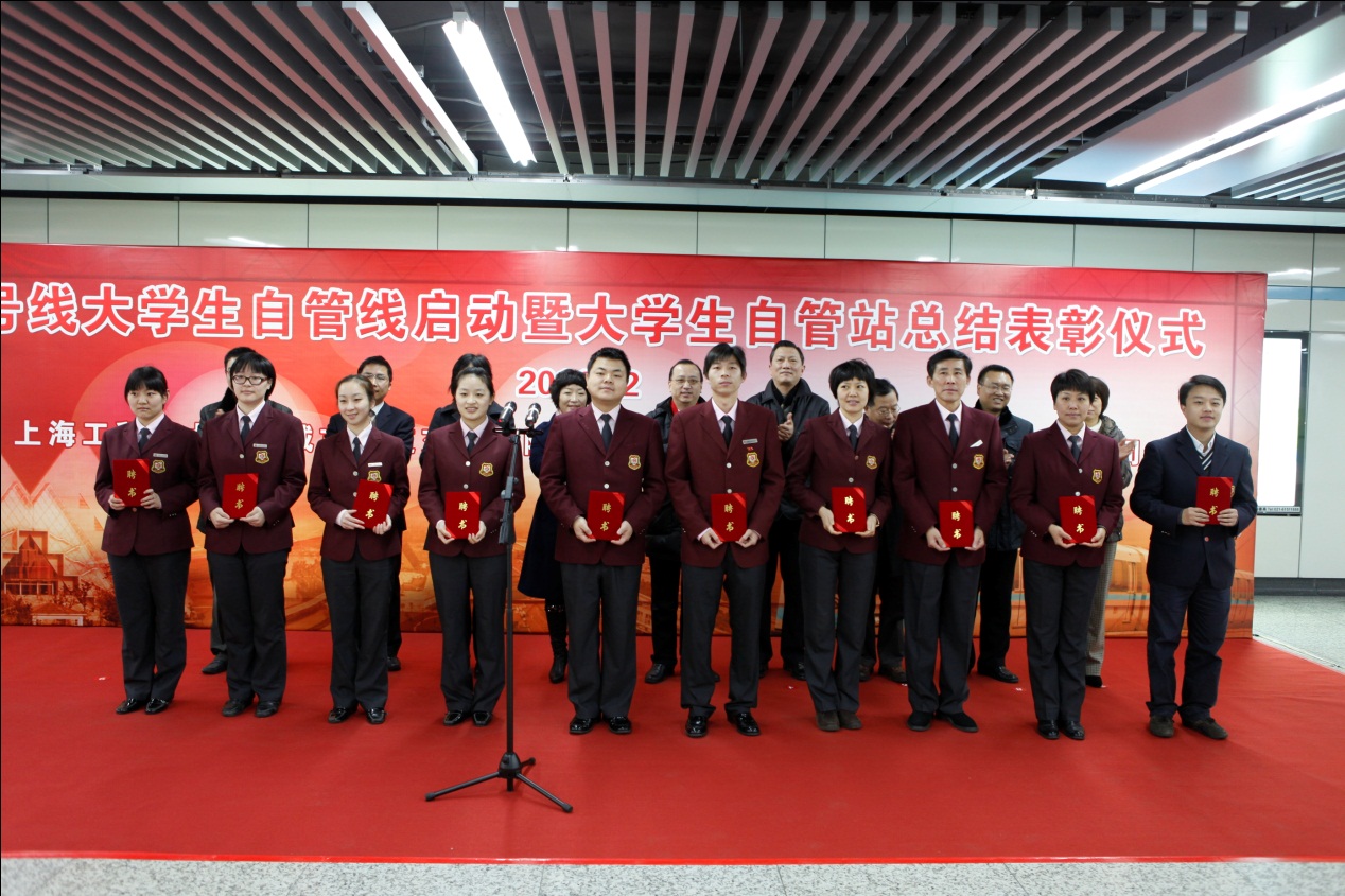 | 12月23日上午,“9号线大学生自管线启动暨大学生自管站总结表彰仪式” 在上海地铁9号线徐家汇站厅举行。上海地铁第一运营有限公司党委蔡洪宇、上海工程技术大学城市轨道交通学院党总支书记缪行外、上海工程技术大学宣传部部长王一川、申通地铁集团党办副主任吴昕毅、上海工程技术大学组织部副部长朱洪春、上海地铁客运一分公司运安部经理孙克晴等出席了启动仪式。  9号线徐家汇站举行了大学生自管线启动暨大学生自管站总结表彰仪式 大学生自管员不同于在地铁车站内维护秩序的志愿者,他们更是专业的地铁服务员、督导员,甚至值班站长,他们能像一般的地铁员工一样参与地铁的日常运营管理,甚至可以跟普通的值班站长一样处理乘客的投诉。自2009年6月“9号线大学生自管站”启动以来,上千名大学生在“自管站”这个平台上,拓宽了大学生的专业视野,提高了创新意识和创新能力。 上海地铁客运一分公司运安部经理孙克晴宣布了优秀地铁自管站志愿者的表彰决定。全体领导为大学生志愿者代表颁发了证书。同时,上海工程技术大学城市轨道交通学院聘请了10位“地铁人”作为青年教师和大学生导员的“职业导航——党员导师”,帮助他们坚定理想信念、增强党性修养。上海工程技术大学组织部副部长朱洪春宣布了党员导师聘任名单,上海工程技术大学宣传部部长王一川与申通地铁集团党办副主任吴昕毅共同为“9号线大学生自管线”揭牌。