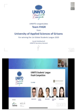 FHGR的参赛团队共5名成员,分别是Leandra Gmünder (瑞士),Aljoscha Keller (瑞士),Mario Schenk (瑞士),Michael von Allmen (瑞士) 和 Wenwen Zhao (中国上海)。比赛一共分为4轮,每一轮都有不同的参赛主题,分别是Challenge 1: Produce Development and Local Communities,Challenge 2: Tourism’s Potential to create more Inclusive Societies,Challenge 3: Tourism Recovery Solutions 和 Challenge 4: Tourism’s Role in Sustainable Economic Growth. 经过4轮比赛,最终取得了第一名的优异成绩。