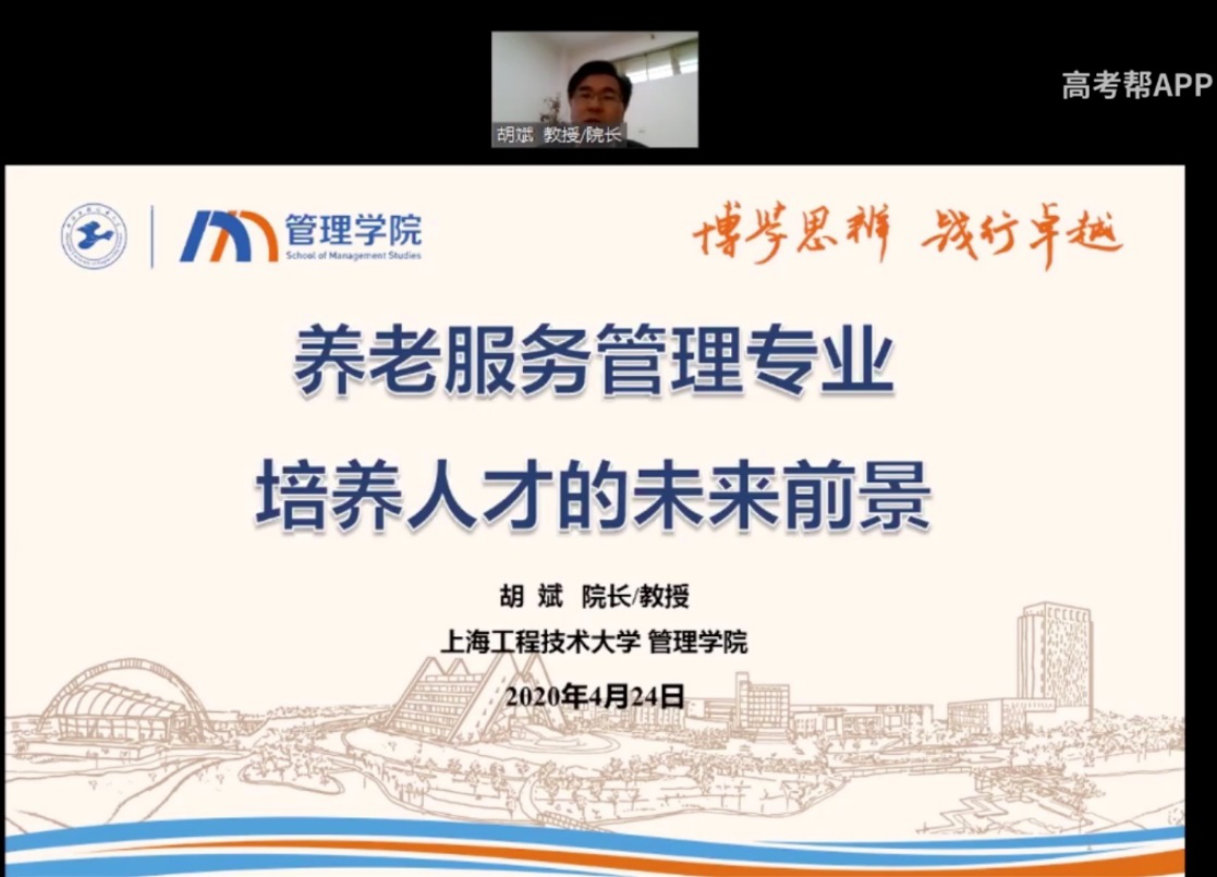 4月25日,管理学院通过高考帮APP,举办线上养老服务专业专题招生咨询会。在专题招生咨询会上,胡斌院长以“养老服务管理专业培养人才的未来前景”为主题,向高考考生及家长,解读了养老服务专业的市场需求与未来前景,介绍了管理学院养老服务专业的建设基础与师资队伍,指出了养老服务专业的人才培养方向和特色,强调了对学生的课程与实践并重的培养模式。此次专题招生咨询会,有力地保障了养老服务管理专业招生工作的顺利进行。