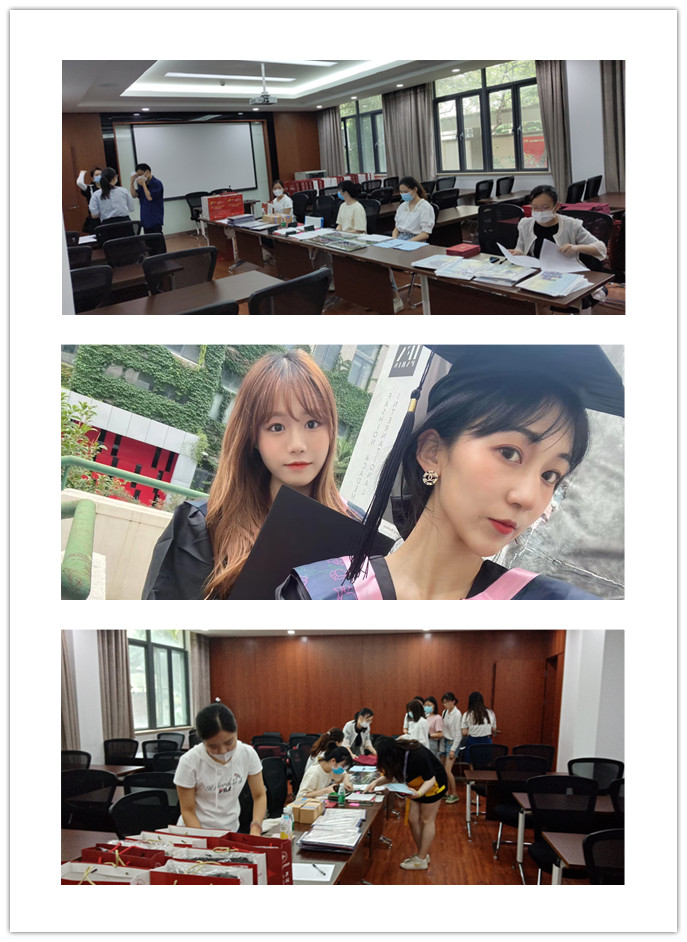 7月24日,纺织服装学院(长宁校区)迎来了2020届学生双证发放和离校时刻,学院王云菲老师、邢洁老师在长宁校区现场为毕业生发证,辅导员沈智莉老师、康敏老师以及志愿者同学现场发放学士服、其他证书材料等。服装与服饰设计(中法合作)专业近百名毕业生返校领取双证以及相关毕业材料。同学们感怀疫情以来的特殊毕业季,在领取证书和材料的间歇,不忘穿上学校赠送的学士服,用镜头记录下了最后的校园时刻。同学们还在微信朋友圈等社交平台发状态纪念匆匆而去的大学生活,回忆过往,珍重再见。