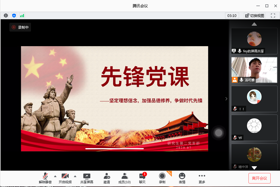 为进一步坚定理想信念、发挥好党员的先锋模范作用,7月28日下午,化学化工学院研究生第二党支部通过腾讯会议平台召开了“先锋党课”专题学习,支部全体党员以及志愿者代表参加学习。