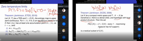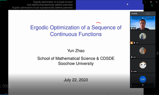 赵云教授介绍了单个连续函数的遍历优化研究进展,阐述了次可加势函数的从属原理和渐近可加势函数在极限条件下各种遍历平均关系,讲解了渐近可加势函数在遍历优化中的各种通有性质:渐近可加势函数所组成空间的构造;通有的遍历优化性质:唯一性、全支撑性、低复杂性。