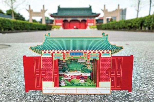 随着内页缓缓拉出,呈现出精美的手绘风格校园风景,蕴含了徐汇校区正门、奉贤图书馆、诺奖中心、C60雕塑、通海湖、龙舟、小花梨等标志性建筑与校园元素,提前让新生们一饱眼福。