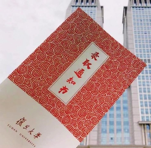 复旦大学2020年大学录取通知书以复旦红为主调,如旭日东升,象征着复旦人的青春朝气,表达对新生的祝福与欢迎。