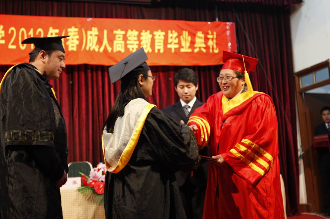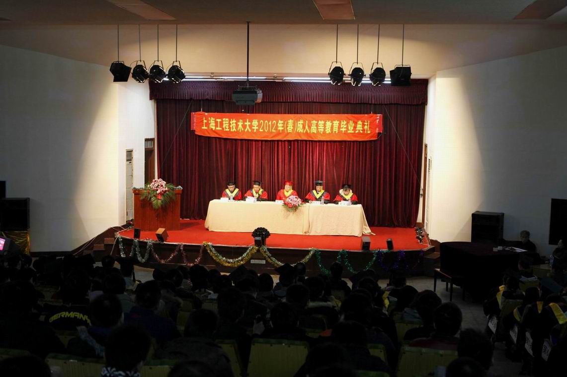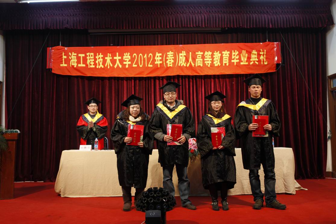 |    1月15日,我校成人高等教育2012年(春季)毕业典礼在新村路校区演讲厅隆重举行。校长汪泓、副校长陈力华出席了毕业典礼,汽车学院党总支书记周洁、机械学院副院长徐滕刚,继续教育学院院长姚黎明、副院长杨国平以及毕业生代表共300多人参加了毕业典礼,毕业典礼由陈力华副校长主持。 毕业典礼在庄严的国歌声中拉开序幕。姚黎明院长介绍了本次成人高等教育毕业生的情况,并宣布高等教育自学考试和成人高等教育本届本科毕业生分别有78人和206人荣获学士学位。陈力华副校长宣读了高等教育自学考试和成人高等教育优秀毕业生名单。一份耕耘一份收获,夜大学14名学生、自考10名学生因勤奋刻苦、成绩优秀荣获成人高等教育优秀毕业生称号,学校领导为他们颁发优秀毕业生荣誉证书和奖品,并对他们取得的成绩给予祝贺。吴国庆老师代表全体教师祝愿同学们事业上取得更大的成就,生活幸福,未来更加美好、辉煌,为上海经济的腾飞、国家的富强做出自己的贡献。高等教育自学考试毕业生代表姜巍同学和成人高等教育毕业生代表秦志明同学对几年来的学习进行了回顾和总结,并代表全体毕业生向母校表达了深深的谢意和浓浓的不舍之情。 汪泓校长发表了热情洋溢的讲话,汪校长首先代表学校向顺利完成学业的毕业生们表示祝贺,并向长期以来辛勤耕耘在教学第一线的教职员工表示感谢。汪校长充分肯定了同学们克服工作和生活上的困难所取得的成绩,鼓励大家“勤于学习,学习是终生任务,使人进步,使人开阔眼界”,并希望大家不断学习、不断进步、不断搏击、不断取得新的成绩。最后,汪校长亲自为参加毕业典礼的每位毕业生颁发毕业证书。 毕业典礼在《毕业歌》的旋律中圆满落下帷幕。