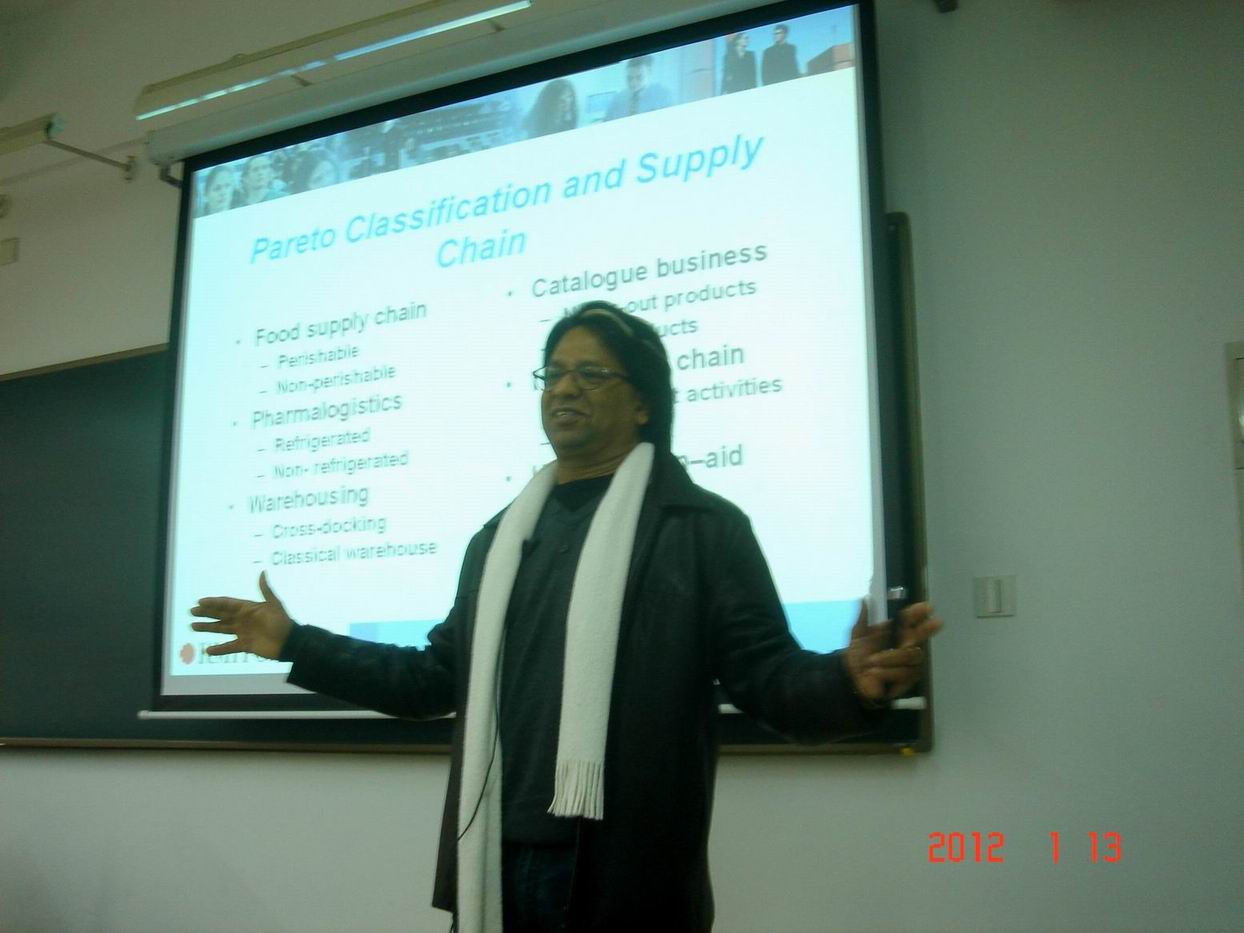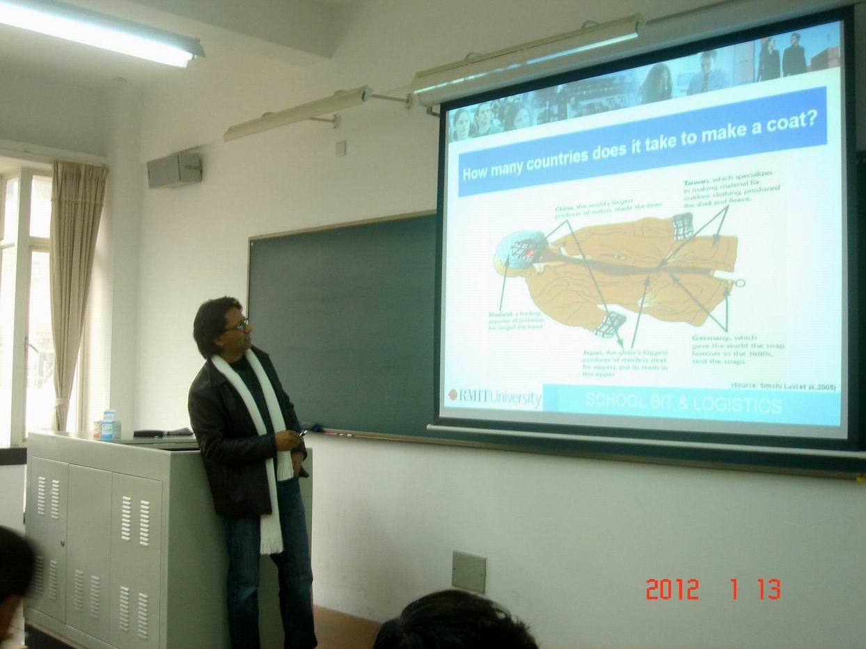 |   为推进管理学院示范性全英语课程建设,提升专业教师的英语课程教学水平,1月13日下午,管理学院在松江校区教学楼D215室举办示范性全英语课程《International Cargo Transportation(国际货物运输)》教学观摩课,盛邀皇家墨尔本理工学院物流和供应链管理系主任拉汉曼·羡姆斯教授(Professor Shams Rahman)莅临我校主讲。 下午1点,在管理学院贸易经济系主任、市级示范性全英语课程(《国际货物运输》)建设项目负责人汤世强教授的陪同下,拉汉曼教授来到教室,受到了国际经济与贸易专业0314081、0314082班同学们的热烈欢迎。 在正式上课前,首先由汤世强教授用中英文对拉汉曼教授简历进行介绍,要求同学们珍惜此次难得的机会,能够从拉汉曼教授的讲授中以及与教授的交流互动中学到更多的专业知识,从新的视角来学习理解运输管理以及其在供应链管理中的重要作用。 和同学们一起聆听的还有管理学院市级示范性全英语课程项目负责人田书格副教授(《系统模型与模拟》课程)、机械学院示范性市级全英语课程项目负责人徐腾岗副教授(《现代工程图学》),以及管理学院校级全英语课程建设项目的数位负责人,另外还有机械工程学院以及社会科学学院的数位教师也慕名前来旁听示范课。 在示范课中,教学经验丰富的拉汉曼教授并没有单纯地直接切入到国际货物运输的教学内容,而是从一个夹克衫全球化生产营销案例入手,从供应链管理理论高度入手引导出国际货物运输教学内容。夹克衫的很多原材料和部件来自于中国、日本、韩国和德国,在中国缝制装配成型,再由中国出口到世界各地市场营销。在夹克衫的供应链各个环节中牵涉到很多的国际货物运输问题,如原材料和成品运输时间的协调控制问题等等。 如在材料货物从供应链中的供应商、生产商、批发商、分销商、零售商、一直到最终的消费者流动过程中,如何提高效率;如何使得下游客户满意;如何创造出价值,这些都离不开运输功能的发挥。拉汉曼教授还进一步从供应链整合和协作出发,从库存控制及消除牛鞭效应出发、从不同需求模型出发、从不同的产品类型出发,从不同的供应链管理模型出发,从国际供应链的风险评估出发,多视角、全方位地阐述问题,最后才引伸出国际货物运输的关键流程节点控制问题和解决方案。 在整个专业教学过程中,拉汉曼教授教学内容既见树木又见森林,教学手段新颖活泼,案例层出不穷,图表丰富多彩,同学们聚精会神听的津津有味,时间不知不觉过的飞快,一节课时间很快就到了,拉汉曼教授最后还留了一点时间让同学们提问,同学们纷纷举手,抓住难得机会,向教授请教。在短短45分钟的示范性全英语课程教学观摩课中,同学们学到很多与国际前沿接轨的专业知识,师生们也领略了外籍教授的学术和教学素养,拉汉曼教授讲课的风采深深地印在同学们的脑海中。 |