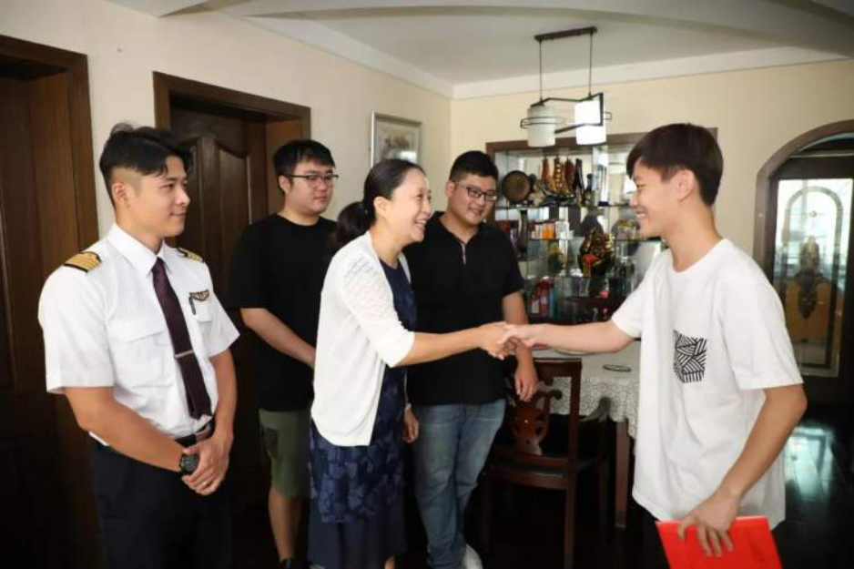 8月11日上午,上海工程技术大学航空运输学院·飞行学院党委书记虞蓉,工程大航飞学院2013届校友、上海航空有限公司责任机长高越,工程大2018届艺术设计学院校友、工程大2020年录取通知书设计者薄海超一同来到邵逸杰同学家中,送上了他梦寐以求的录取通知书。