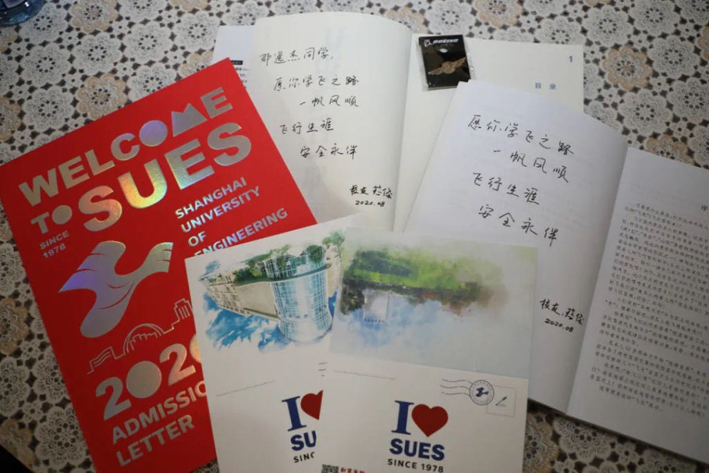 邵逸杰同学已被上海工程技术大学航空运输学院·飞行学院飞行技术专业录取,随着录取通知书送达的还有中国商飞试飞中心试飞二中队中队长、执行C919首飞机长、工程大航飞学院1995级校友蔡俊亲笔签名的《飞机、飞行和我》和《认识飞行》两本书。书上,蔡俊校友寄语邵逸杰同学:“愿你飞行之路,一帆风顺;飞行生涯,安全永伴。”
