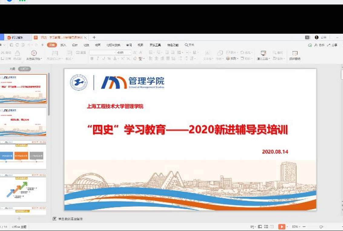 为贯彻落实立德树人根本任务,切实提高辅导员履职能力,加强学院辅导员队伍职业化、专业化建设,提升辅导员的“四史”学习意识能力,8月14日,管理学院举办了新进辅导员“四史”学习教育专题培训会。院党委副书记程玉莲老师、张强老师,本科生辅导员吉祥老师,研究生辅导员徐佳老师,以及8名新进辅导员老师参加了培训,培训会由吉祥老师主持。