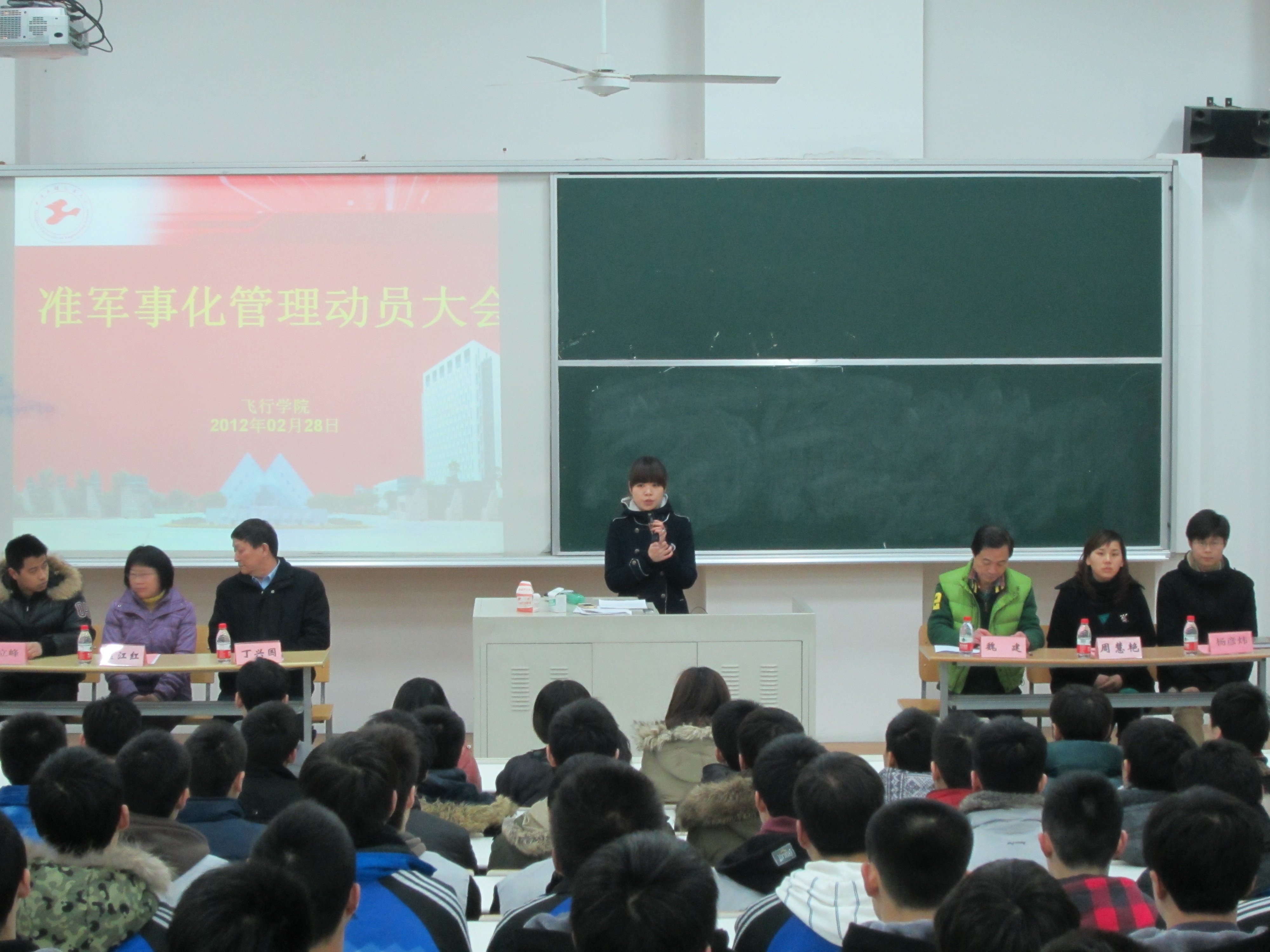 |   2月28日晚,航空运输·飞行学院在F320召开飞行学院准军事化管理动员大会,飞行学院执行院长魏建、飞行学院院长丁兴国、教学副院长匡江红、学院党总支副书记周慧艳、10级教导员孙立峰、09级实习教导员杨彦炜以及学院飞行技术专业的全体教师受邀出席,此次会议由飞行学院11级教导员周晓舟主持。 大会开始,匡江红副院长就教学上的问题提出了准军事化管理要求,并针对诚实守信这一品质,向所有飞行技术专业的学员们提出了严格的要求。随后,周慧艳副书记详细介绍了普通学生校园行为规范及飞行学员准军事化管理规范,从两个方面归纳了飞行技术专业学生在我校所要遵守的日常制度。学院党总支周慧艳副书记要求同学们不但要履行一个普通高等学校学生的在校职责和规范,还要同时执行飞行学员学生准军事化管理条例。 之后,丁兴国院长对全体学员一直以来在各方面做出的努力及取得的成绩给予了极大的肯定,并用朴实而又生动的语言结合自己多年的部队和飞行经验对在场的所有人进行了思想上的教育。在谈话中号召全体学员应将“忠诚、坚强、感恩、上进”的八个字牢记在心,要求在座的准飞行员们要将这八个字贯穿到自己三年的学习生活乃至未来将要从事的事业中去,同时祝愿同学们能早日飞向广阔的蓝天。最后,全体学员在各年级教导员的带领下宣读了“飞行技术专业学生准军事化管理誓言”。 通过这次动员大会,所有飞行学员都充分的认识到了自己在将来的学习和工作任务中所要肩负的重任,为将来成为一名真正的航空人而努力拼搏树立了更加坚定的信心。 |